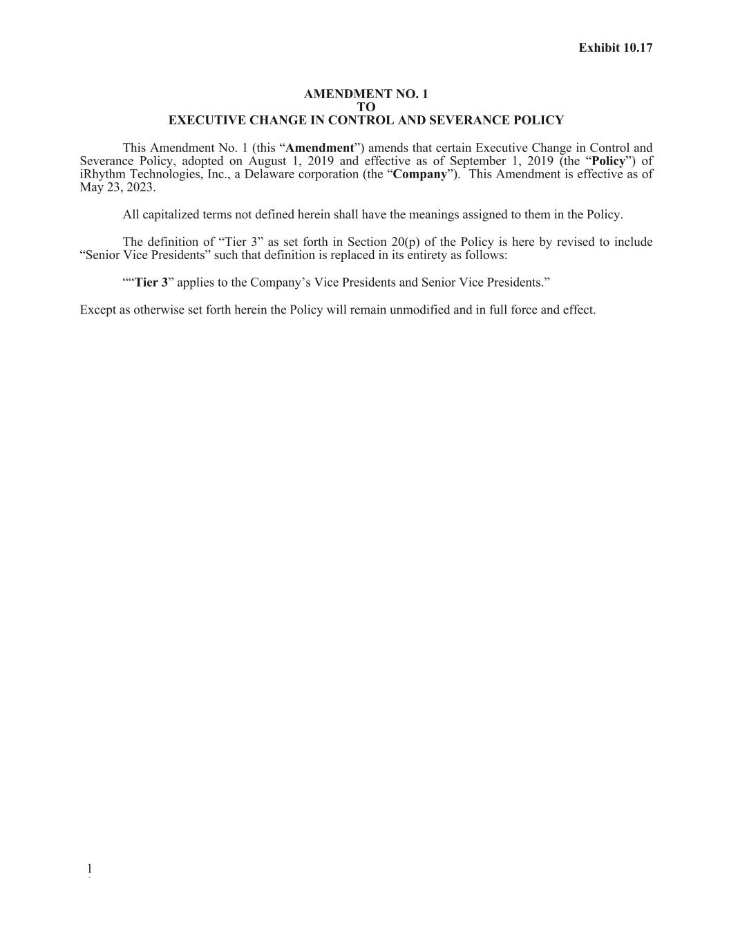 AMENDMENT NO. 1 TO EXECUTIVE CHANGE IN CONTROL AND SEVERANCE POLICY This Amendment No. 1 (this “Amendment”) amends that certain Executive Change in Control and Severance Policy, adopted on August 1, 2019 and effective as of September 1, 2019 (the “Policy”) of iRhythm Technologies, Inc., a Delaware corporation (the “Company”). This Amendment is effective as of May 23, 2023. All capitalized terms not defined herein shall have the meanings assigned to them in the Policy. The definition of “Tier 3” as set forth in Section 20(p) of the Policy is here by revised to include “Senior Vice Presidents” such that definition is replaced in its entirety as follows: ““Tier 3” applies to the Company’s Vice Presidents and Senior Vice Presidents.” Except as otherwise set forth herein the Policy will remain unmodified and in full force and effect. Exhibit 10.17 1 3