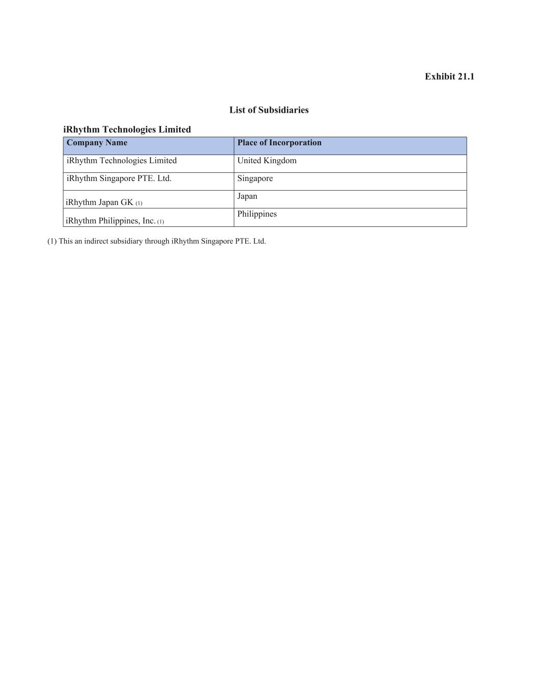 Exhibit 21.1 List of Subsidiaries iRhythm Technologies Limited Company Name Place of Incorporation iRhythm Technologies Limited United Kingdom iRhythm Singapore PTE. Ltd. Singapore iRhythm Japan GK (1) Japan iRhythm Philippines, Inc. (1) Philippines (1) This an indirect subsidiary through iRhythm Singapore PTE. Ltd.