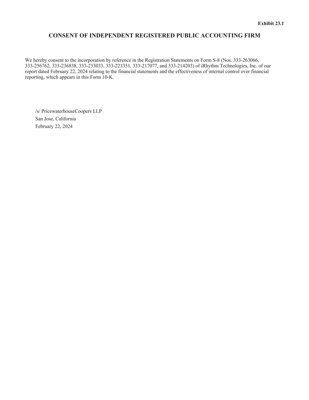 Exhibit 23.1 CONSENT OF INDEPENDENT REGISTERED PUBLIC ACCOUNTING FIRM We hereby consent to the incorporation by reference in the Registration Statements on Form S-8 (Nos. 333-263066, 333-256762, 333-236838, 333-233033, 333-223351, 333-217077, and 333-214203) of iRhythm Technologies, Inc. of our report dated February 22, 2024 relating to the financial statements and the effectiveness of internal control over financial reporting, which appears in this Form 10-K. /s/ PricewaterhouseCoopers LLP San Jose, California February 22, 2024