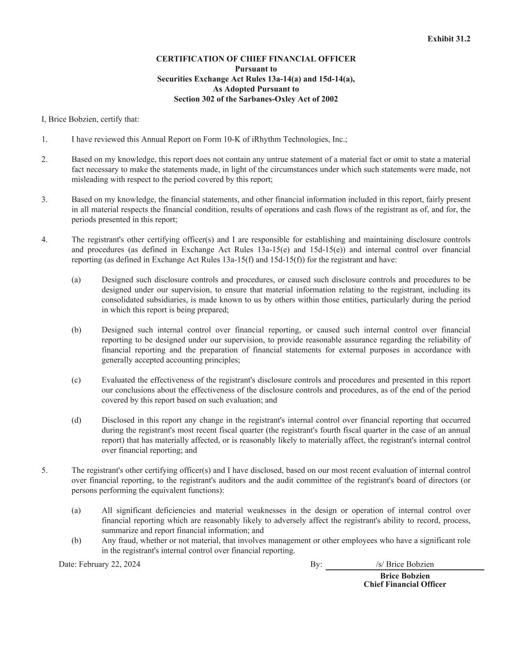 Exhibit 31.2 CERTIFICATION OF CHIEF FINANCIAL OFFICER Pursuant to Securities Exchange Act Rules 13a-14(a) and 15d-14(a), As Adopted Pursuant to Section 302 of the Sarbanes-Oxley Act of 2002 I, Brice Bobzien, certify that: 1. I have reviewed this Annual Report on Form 10-K of iRhythm Technologies, Inc.; 2. Based on my knowledge, this report does not contain any untrue statement of a material fact or omit to state a material fact necessary to make the statements made, in light of the circumstances under which such statements were made, not misleading with respect to the period covered by this report; 3. Based on my knowledge, the financial statements, and other financial information included in this report, fairly present in all material respects the financial condition, results of operations and cash flows of the registrant as of, and for, the periods presented in this report; 4. The registrant's other certifying officer(s) and I are responsible for establishing and maintaining disclosure controls and procedures (as defined in Exchange Act Rules 13a-15(e) and 15d-15(e)) and internal control over financial reporting (as defined in Exchange Act Rules 13a-15(f) and 15d-15(f)) for the registrant and have: (a) Designed such disclosure controls and procedures, or caused such disclosure controls and procedures to be designed under our supervision, to ensure that material information relating to the registrant, including its consolidated subsidiaries, is made known to us by others within those entities, particularly during the period in which this report is being prepared; (b) Designed such internal control over financial reporting, or caused such internal control over financial reporting to be designed under our supervision, to provide reasonable assurance regarding the reliability of financial reporting and the preparation of financial statements for external purposes in accordance with generally accepted accounting principles; (c) Evaluated the effectiveness of the registrant's disclosure controls and procedures and presented in this report our conclusions about the effectiveness of the disclosure controls and procedures, as of the end of the period covered by this report based on such evaluation; and (d) Disclosed in this report any change in the registrant's internal control over financial reporting that occurred during the registrant's most recent fiscal quarter (the registrant's fourth fiscal quarter in the case of an annual report) that has materially affected, or is reasonably likely to materially affect, the registrant's internal control over financial reporting; and 5. The registrant's other certifying officer(s) and I have disclosed, based on our most recent evaluation of internal control over financial reporting, to the registrant's auditors and the audit committee of the registrant's board of directors (or persons performing the equivalent functions): (a) All significant deficiencies and material weaknesses in the design or operation of internal control over financial reporting which are reasonably likely to adversely affect the registrant's ability to record, process, summarize and report financial information; and (b) Any fraud, whether or not material, that involves management or other employees who have a significant role in the registrant's internal control over financial reporting. Date: February 22, 2024 By: /s/ Brice Bobzien Brice Bobzien Chief Financial Officer