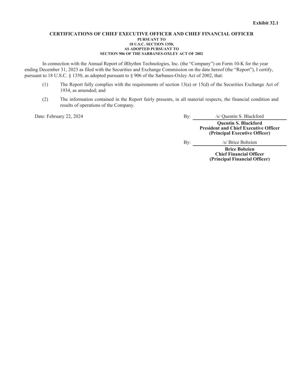 Exhibit 32.1 CERTIFICATIONS OF CHIEF EXECUTIVE OFFICER AND CHIEF FINANCIAL OFFICER PURSUANT TO 18 U.S.C. SECTION 1350, AS ADOPTED PURSUANT TO SECTION 906 OF THE SARBANES-OXLEY ACT OF 2002 In connection with the Annual Report of iRhythm Technologies, Inc. (the “Company”) on Form 10-K for the year ending December 31, 2023 as filed with the Securities and Exchange Commission on the date hereof (the “Report”), I certify, pursuant to 18 U.S.C. § 1350, as adopted pursuant to § 906 of the Sarbanes-Oxley Act of 2002, that: (1) The Report fully complies with the requirements of section 13(a) or 15(d) of the Securities Exchange Act of 1934, as amended; and (2) The information contained in the Report fairly presents, in all material respects, the financial condition and results of operations of the Company. Date: February 22, 2024 By: /s/ Quentin S. Blackford Quentin S. Blackford President and Chief Executive Officer (Principal Executive Officer) By: /s/ Brice Bobzien Brice Bobzien Chief Financial Officer (Principal Financial Officer)