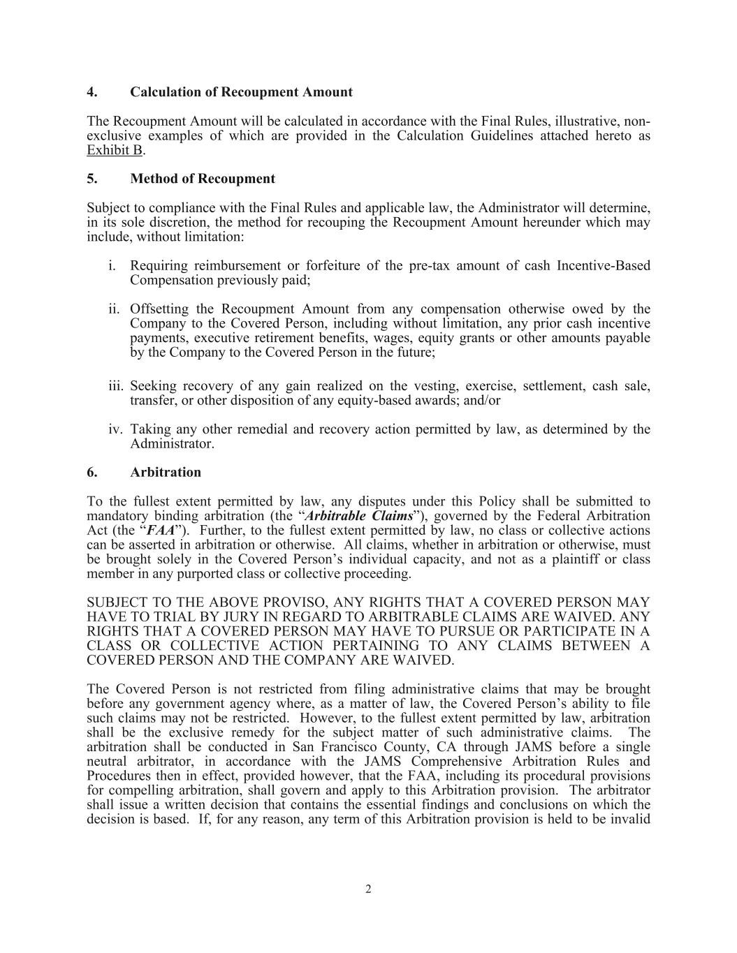 4. Calculation of Recoupment Amount The Recoupment Amount will be calculated in accordance with the Final Rules, illustrative, non- exclusive examples of which are provided in the Calculation Guidelines attached hereto as Exhibit B. 5. Method of Recoupment Subject to compliance with the Final Rules and applicable law, the Administrator will determine, in its sole discretion, the method for recouping the Recoupment Amount hereunder which may include, without limitation: i. Requiring reimbursement or forfeiture of the pre-tax amount of cash Incentive-Based Compensation previously paid; ii. Offsetting the Recoupment Amount from any compensation otherwise owed by the Company to the Covered Person, including without limitation, any prior cash incentive payments, executive retirement benefits, wages, equity grants or other amounts payable by the Company to the Covered Person in the future; iii. Seeking recovery of any gain realized on the vesting, exercise, settlement, cash sale, transfer, or other disposition of any equity-based awards; and/or iv. Taking any other remedial and recovery action permitted by law, as determined by the Administrator. 6. Arbitration To the fullest extent permitted by law, any disputes under this Policy shall be submitted to mandatory binding arbitration (the “Arbitrable Claims”), governed by the Federal Arbitration Act (the “FAA”). Further, to the fullest extent permitted by law, no class or collective actions can be asserted in arbitration or otherwise. All claims, whether in arbitration or otherwise, must be brought solely in the Covered Person’s individual capacity, and not as a plaintiff or class member in any purported class or collective proceeding. SUBJECT TO THE ABOVE PROVISO, ANY RIGHTS THAT A COVERED PERSON MAY HAVE TO TRIAL BY JURY IN REGARD TO ARBITRABLE CLAIMS ARE WAIVED. ANY RIGHTS THAT A COVERED PERSON MAY HAVE TO PURSUE OR PARTICIPATE IN A CLASS OR COLLECTIVE ACTION PERTAINING TO ANY CLAIMS BETWEEN A COVERED PERSON AND THE COMPANY ARE WAIVED. The Covered Person is not restricted from filing administrative claims that may be brought before any government agency where, as a matter of law, the Covered Person’s ability to file such claims may not be restricted. However, to the fullest extent permitted by law, arbitration shall be the exclusive remedy for the subject matter of such administrative claims. The arbitration shall be conducted in San Francisco County, CA through JAMS before a single neutral arbitrator, in accordance with the JAMS Comprehensive Arbitration Rules and Procedures then in effect, provided however, that the FAA, including its procedural provisions for compelling arbitration, shall govern and apply to this Arbitration provision. The arbitrator shall issue a written decision that contains the essential findings and conclusions on which the decision is based. If, for any reason, any term of this Arbitration provision is held to be invalid 2