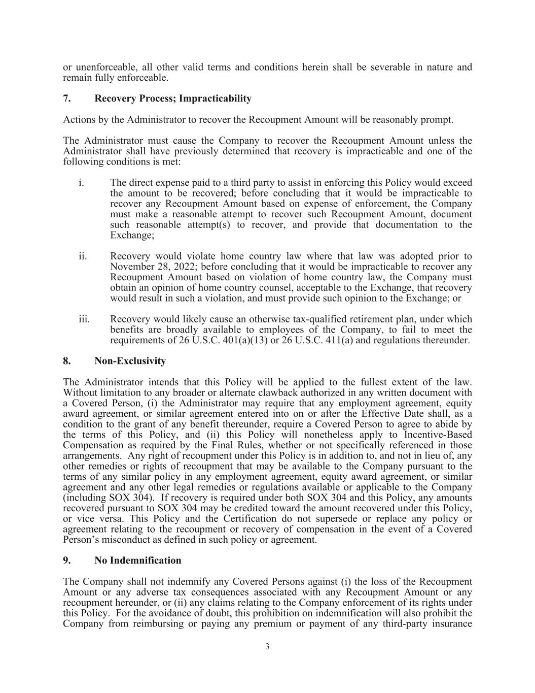 or unenforceable, all other valid terms and conditions herein shall be severable in nature and remain fully enforceable. 7. Recovery Process; Impracticability Actions by the Administrator to recover the Recoupment Amount will be reasonably prompt. The Administrator must cause the Company to recover the Recoupment Amount unless the Administrator shall have previously determined that recovery is impracticable and one of the following conditions is met: i. The direct expense paid to a third party to assist in enforcing this Policy would exceed the amount to be recovered; before concluding that it would be impracticable to recover any Recoupment Amount based on expense of enforcement, the Company must make a reasonable attempt to recover such Recoupment Amount, document such reasonable attempt(s) to recover, and provide that documentation to the Exchange; ii. Recovery would violate home country law where that law was adopted prior to November 28, 2022; before concluding that it would be impracticable to recover any Recoupment Amount based on violation of home country law, the Company must obtain an opinion of home country counsel, acceptable to the Exchange, that recovery would result in such a violation, and must provide such opinion to the Exchange; or iii. Recovery would likely cause an otherwise tax-qualified retirement plan, under which benefits are broadly available to employees of the Company, to fail to meet the requirements of 26 U.S.C. 401(a)(13) or 26 U.S.C. 411(a) and regulations thereunder. 8. Non-Exclusivity The Administrator intends that this Policy will be applied to the fullest extent of the law. Without limitation to any broader or alternate clawback authorized in any written document with a Covered Person, (i) the Administrator may require that any employment agreement, equity award agreement, or similar agreement entered into on or after the Effective Date shall, as a condition to the grant of any benefit thereunder, require a Covered Person to agree to abide by the terms of this Policy, and (ii) this Policy will nonetheless apply to Incentive-Based Compensation as required by the Final Rules, whether or not specifically referenced in those arrangements. Any right of recoupment under this Policy is in addition to, and not in lieu of, any other remedies or rights of recoupment that may be available to the Company pursuant to the terms of any similar policy in any employment agreement, equity award agreement, or similar agreement and any other legal remedies or regulations available or applicable to the Company (including SOX 304). If recovery is required under both SOX 304 and this Policy, any amounts recovered pursuant to SOX 304 may be credited toward the amount recovered under this Policy, or vice versa. This Policy and the Certification do not supersede or replace any policy or agreement relating to the recoupment or recovery of compensation in the event of a Covered Person’s misconduct as defined in such policy or agreement. 9. No Indemnification The Company shall not indemnify any Covered Persons against (i) the loss of the Recoupment Amount or any adverse tax consequences associated with any Recoupment Amount or any recoupment hereunder, or (ii) any claims relating to the Company enforcement of its rights under this Policy. For the avoidance of doubt, this prohibition on indemnification will also prohibit the Company from reimbursing or paying any premium or payment of any third-party insurance 3