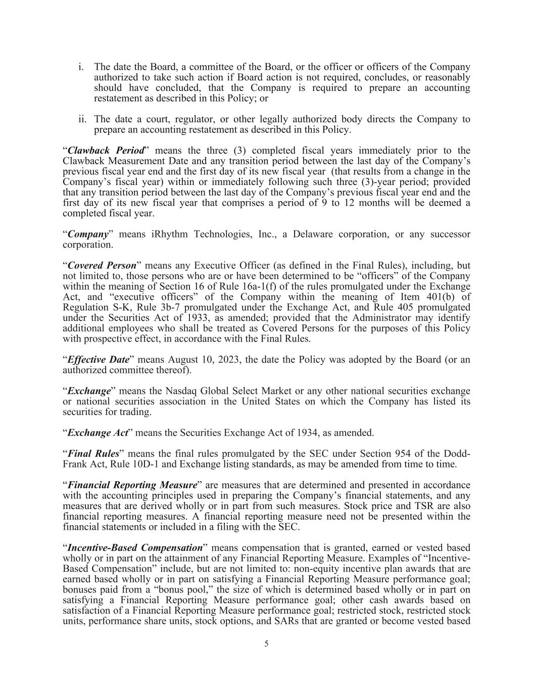 i. The date the Board, a committee of the Board, or the officer or officers of the Company authorized to take such action if Board action is not required, concludes, or reasonably should have concluded, that the Company is required to prepare an accounting restatement as described in this Policy; or ii. The date a court, regulator, or other legally authorized body directs the Company to prepare an accounting restatement as described in this Policy. “Clawback Period” means the three (3) completed fiscal years immediately prior to the Clawback Measurement Date and any transition period between the last day of the Company’s previous fiscal year end and the first day of its new fiscal year (that results from a change in the Company’s fiscal year) within or immediately following such three (3)-year period; provided that any transition period between the last day of the Company’s previous fiscal year end and the first day of its new fiscal year that comprises a period of 9 to 12 months will be deemed a completed fiscal year. “Company” means iRhythm Technologies, Inc., a Delaware corporation, or any successor corporation. “Covered Person” means any Executive Officer (as defined in the Final Rules), including, but not limited to, those persons who are or have been determined to be “officers” of the Company within the meaning of Section 16 of Rule 16a-1(f) of the rules promulgated under the Exchange Act, and “executive officers” of the Company within the meaning of Item 401(b) of Regulation S-K, Rule 3b-7 promulgated under the Exchange Act, and Rule 405 promulgated under the Securities Act of 1933, as amended; provided that the Administrator may identify additional employees who shall be treated as Covered Persons for the purposes of this Policy with prospective effect, in accordance with the Final Rules. “Effective Date” means August 10, 2023, the date the Policy was adopted by the Board (or an authorized committee thereof). “Exchange” means the Nasdaq Global Select Market or any other national securities exchange or national securities association in the United States on which the Company has listed its securities for trading. “Exchange Act” means the Securities Exchange Act of 1934, as amended. “Final Rules” means the final rules promulgated by the SEC under Section 954 of the Dodd- Frank Act, Rule 10D-1 and Exchange listing standards, as may be amended from time to time. “Financial Reporting Measure” are measures that are determined and presented in accordance with the accounting principles used in preparing the Company’s financial statements, and any measures that are derived wholly or in part from such measures. Stock price and TSR are also financial reporting measures. A financial reporting measure need not be presented within the financial statements or included in a filing with the SEC. “Incentive-Based Compensation” means compensation that is granted, earned or vested based wholly or in part on the attainment of any Financial Reporting Measure. Examples of “Incentive- Based Compensation” include, but are not limited to: non-equity incentive plan awards that are earned based wholly or in part on satisfying a Financial Reporting Measure performance goal; bonuses paid from a “bonus pool,” the size of which is determined based wholly or in part on satisfying a Financial Reporting Measure performance goal; other cash awards based on satisfaction of a Financial Reporting Measure performance goal; restricted stock, restricted stock units, performance share units, stock options, and SARs that are granted or become vested based 5