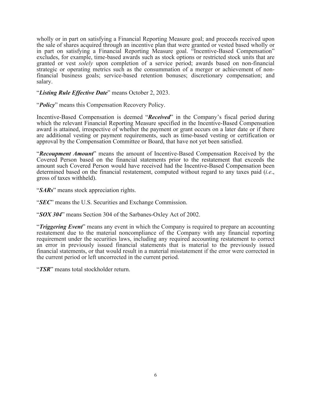 wholly or in part on satisfying a Financial Reporting Measure goal; and proceeds received upon the sale of shares acquired through an incentive plan that were granted or vested based wholly or in part on satisfying a Financial Reporting Measure goal. “Incentive-Based Compensation” excludes, for example, time-based awards such as stock options or restricted stock units that are granted or vest solely upon completion of a service period; awards based on non-financial strategic or operating metrics such as the consummation of a merger or achievement of non- financial business goals; service-based retention bonuses; discretionary compensation; and salary. “Listing Rule Effective Date” means October 2, 2023. “Policy” means this Compensation Recovery Policy. Incentive-Based Compensation is deemed “Received” in the Company’s fiscal period during which the relevant Financial Reporting Measure specified in the Incentive-Based Compensation award is attained, irrespective of whether the payment or grant occurs on a later date or if there are additional vesting or payment requirements, such as time-based vesting or certification or approval by the Compensation Committee or Board, that have not yet been satisfied. “Recoupment Amount” means the amount of Incentive-Based Compensation Received by the Covered Person based on the financial statements prior to the restatement that exceeds the amount such Covered Person would have received had the Incentive-Based Compensation been determined based on the financial restatement, computed without regard to any taxes paid (i.e., gross of taxes withheld). “SARs” means stock appreciation rights. “SEC” means the U.S. Securities and Exchange Commission. “SOX 304” means Section 304 of the Sarbanes-Oxley Act of 2002. “Triggering Event” means any event in which the Company is required to prepare an accounting restatement due to the material noncompliance of the Company with any financial reporting requirement under the securities laws, including any required accounting restatement to correct an error in previously issued financial statements that is material to the previously issued financial statements, or that would result in a material misstatement if the error were corrected in the current period or left uncorrected in the current period. “TSR” means total stockholder return. 6