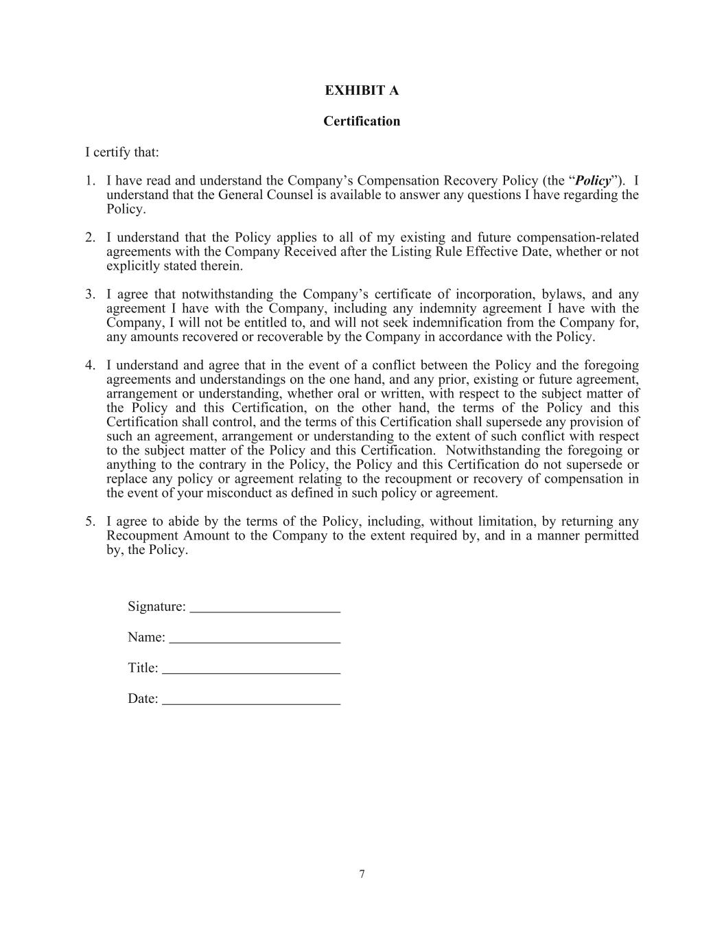 EXHIBIT A Certification I certify that: 1. I have read and understand the Company’s Compensation Recovery Policy (the “Policy”). I understand that the General Counsel is available to answer any questions I have regarding the Policy. 2. I understand that the Policy applies to all of my existing and future compensation-related agreements with the Company Received after the Listing Rule Effective Date, whether or not explicitly stated therein. 3. I agree that notwithstanding the Company’s certificate of incorporation, bylaws, and any agreement I have with the Company, including any indemnity agreement I have with the Company, I will not be entitled to, and will not seek indemnification from the Company for, any amounts recovered or recoverable by the Company in accordance with the Policy. 4. I understand and agree that in the event of a conflict between the Policy and the foregoing agreements and understandings on the one hand, and any prior, existing or future agreement, arrangement or understanding, whether oral or written, with respect to the subject matter of the Policy and this Certification, on the other hand, the terms of the Policy and this Certification shall control, and the terms of this Certification shall supersede any provision of such an agreement, arrangement or understanding to the extent of such conflict with respect to the subject matter of the Policy and this Certification. Notwithstanding the foregoing or anything to the contrary in the Policy, the Policy and this Certification do not supersede or replace any policy or agreement relating to the recoupment or recovery of compensation in the event of your misconduct as defined in such policy or agreement. 5. I agree to abide by the terms of the Policy, including, without limitation, by returning any Recoupment Amount to the Company to the extent required by, and in a manner permitted by, the Policy. Signature: Name: Title: Date: 7