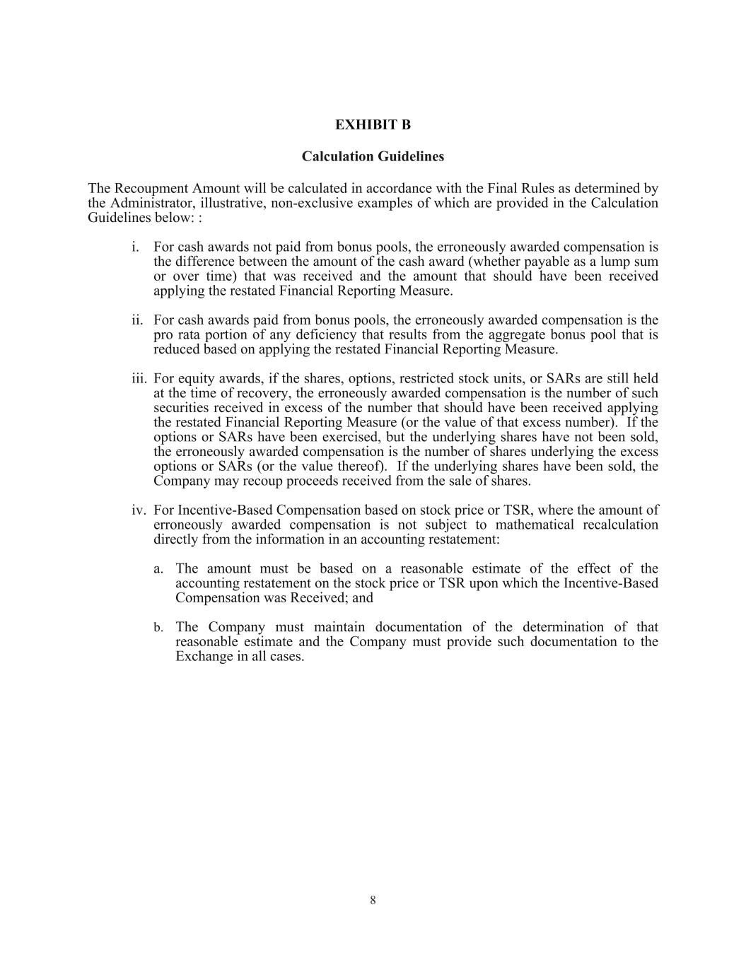 EXHIBIT B Calculation Guidelines The Recoupment Amount will be calculated in accordance with the Final Rules as determined by the Administrator, illustrative, non-exclusive examples of which are provided in the Calculation Guidelines below: : i. For cash awards not paid from bonus pools, the erroneously awarded compensation is the difference between the amount of the cash award (whether payable as a lump sum or over time) that was received and the amount that should have been received applying the restated Financial Reporting Measure. ii. For cash awards paid from bonus pools, the erroneously awarded compensation is the pro rata portion of any deficiency that results from the aggregate bonus pool that is reduced based on applying the restated Financial Reporting Measure. iii. For equity awards, if the shares, options, restricted stock units, or SARs are still held at the time of recovery, the erroneously awarded compensation is the number of such securities received in excess of the number that should have been received applying the restated Financial Reporting Measure (or the value of that excess number). If the options or SARs have been exercised, but the underlying shares have not been sold, the erroneously awarded compensation is the number of shares underlying the excess options or SARs (or the value thereof). If the underlying shares have been sold, the Company may recoup proceeds received from the sale of shares. iv. For Incentive-Based Compensation based on stock price or TSR, where the amount of erroneously awarded compensation is not subject to mathematical recalculation directly from the information in an accounting restatement: a. The amount must be based on a reasonable estimate of the effect of the accounting restatement on the stock price or TSR upon which the Incentive-Based Compensation was Received; and b. The Company must maintain documentation of the determination of that reasonable estimate and the Company must provide such documentation to the Exchange in all cases. 8