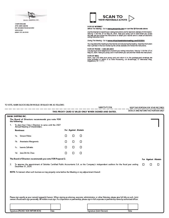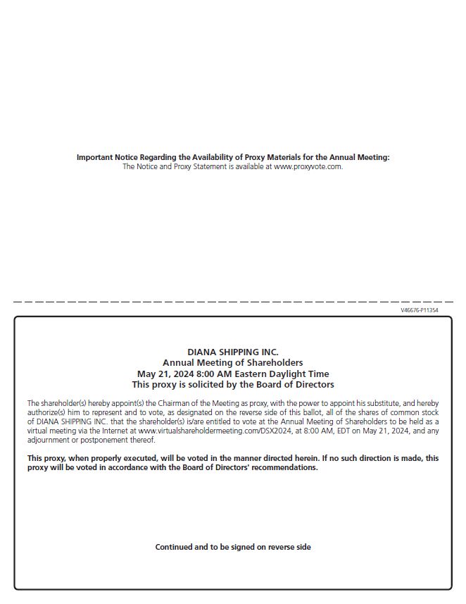 “Common Shares”) (such holders, the “Shareholders”) of Diana Shipping Inc. (the “Company”) will be held on May 21, 2024 at 8:00 a.m. Eastern Daylight Time (the “Meeting”). The Meeting will be conducted completely as a virtual meeting via the