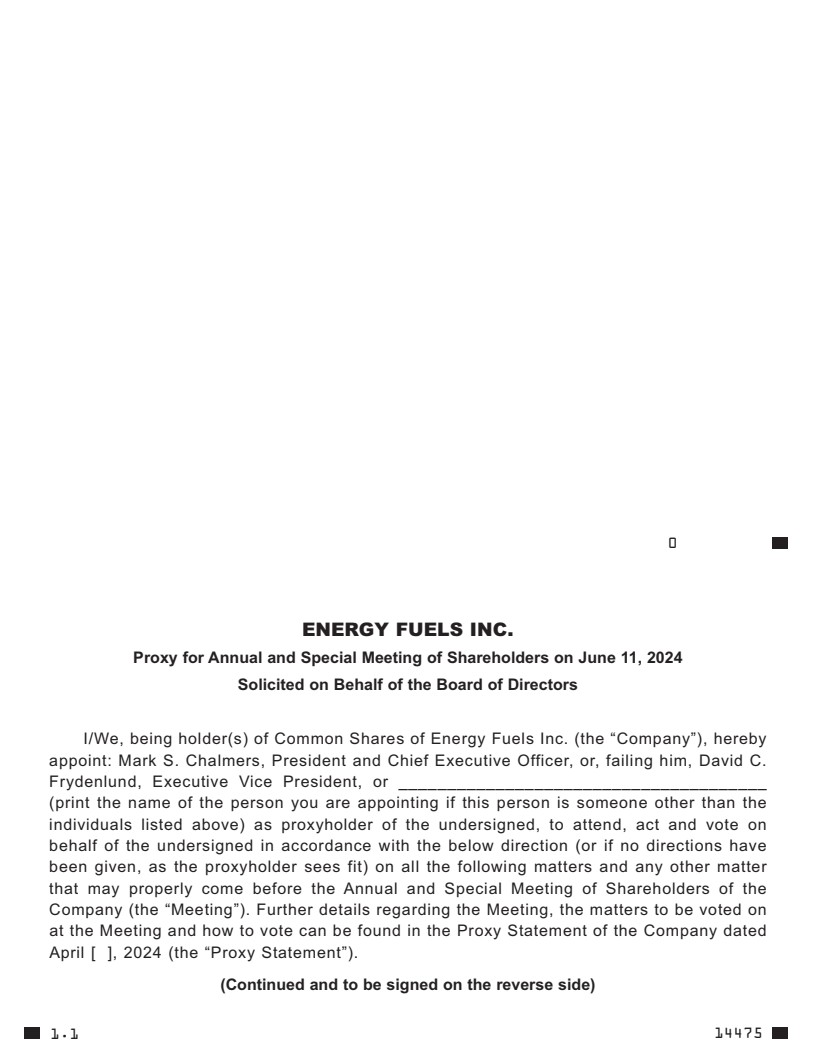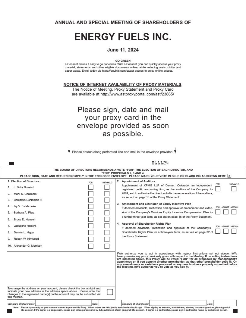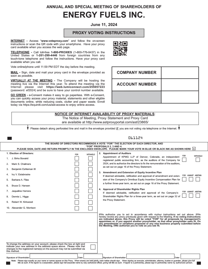 On behalf of Energy Fuels’ Board of Directors, I am pleased to invite you to the 2024 annual and special meeting of shareholders, to be held on Tuesday, June 11, 2024 by way of a live audio webcast with integrated slides and real-time balloting. Our Proxy Statement, which you will find starting on page 4, offers useful information regarding this year’s items of business, details on how to attend and participate in the virtual meeting and how to cast your vote by proxy or virtually during the meeting.