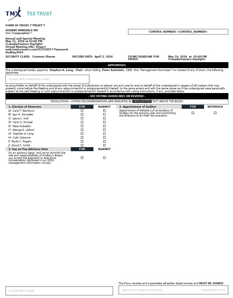 On April 11, 2024, Hudbay Minerals Inc. (“Hudbay”) filed on the Canadian Securities Administrators’ System for Electronic Document Analysis and Retrieval (SEDAR) website at www.sedarplus.ca the following documents: (1) Notice of Annual and Special Meeting of Shareholders, (2) Management Information Circular, (3) Notice and Access Notice, (4) Form of Proxy.