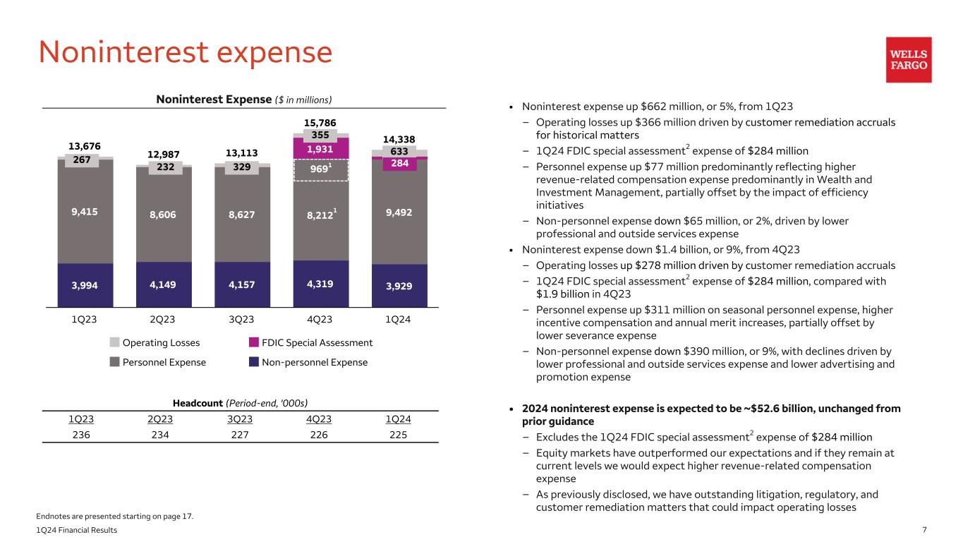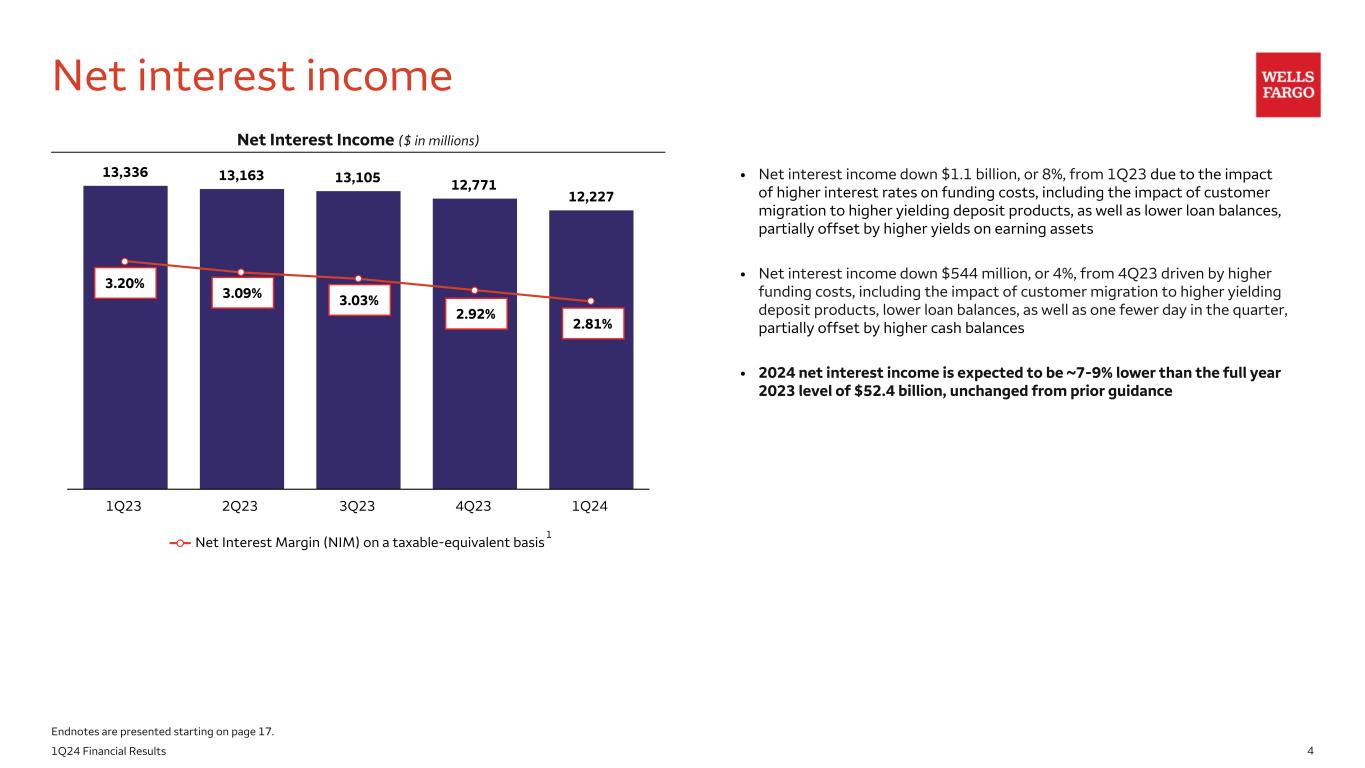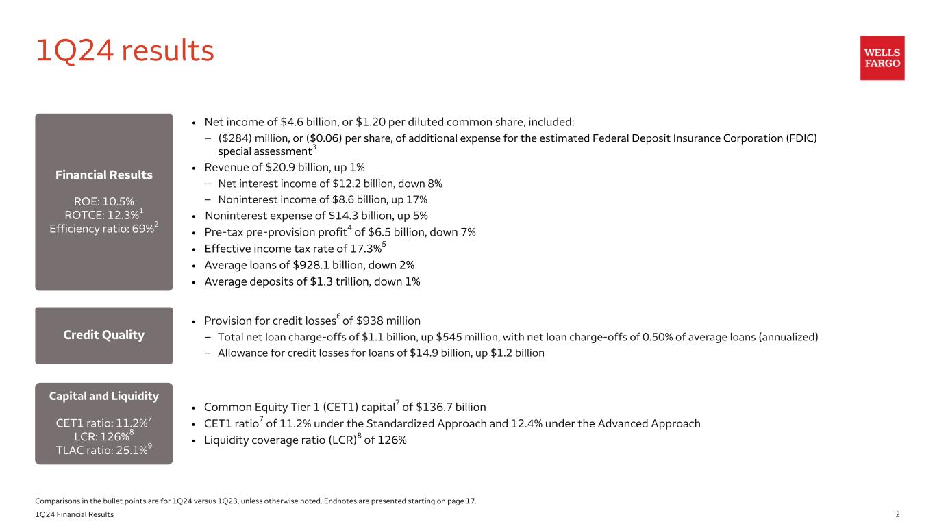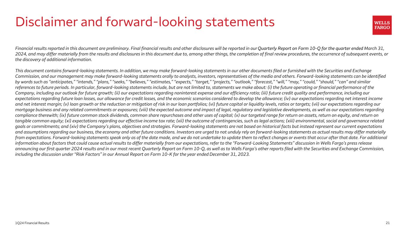 211Q24 Financial Results Disclaimer and forward-looking statements Financial results reported in this document are preliminary. Final financial results and other disclosures will be reported in our Quarterly Report on Form 10-Q for the quarter ended March 31, 2024, and may differ materially from the results and disclosures in this document due to, among other things, the completion of final review procedures, the occurrence of subsequent events, or the discovery of additional information. This document contains forward-looking statements. In addition, we may make forward-looking statements in our other documents filed or furnished with the Securities and Exchange Commission, and our management may make forward-looking statements orally to analysts, investors, representatives of the media and others. Forward-looking statements can be identified by words such as “anticipates,” “intends,” “plans,” “seeks,” “believes,” “estimates,” “expects,” “target,” “projects,” “outlook,” “forecast,” “will,” “may,” “could,” “should,” “can” and similar references to future periods. In particular, forward-looking statements include, but are not limited to, statements we make about: (i) the future operating or financial performance of the Company, including our outlook for future growth; (ii) our expectations regarding noninterest expense and our efficiency ratio; (iii) future credit quality and performance, including our expectations regarding future loan losses, our allowance for credit losses, and the economic scenarios considered to develop the allowance; (iv) our expectations regarding net interest income and net interest margin; (v) loan growth or the reduction or mitigation of risk in our loan portfolios; (vi) future capital or liquidity levels, ratios or targets; (vii) our expectations regarding our mortgage business and any related commitments or exposures; (viii) the expected outcome and impact of legal, regulatory and legislative developments, as well as our expectations regarding compliance therewith; (ix) future common stock dividends, common share repurchases and other uses of capital; (x) our targeted range for return on assets, return on equity, and return on tangible common equity; (xi) expectations regarding our effective income tax rate; (xii) the outcome of contingencies, such as legal actions; (xiii) environmental, social and governance related goals or commitments; and (xiv) the Company’s plans, objectives and strategies. Forward-looking statements are not based on historical facts but instead represent our current expectations and assumptions regarding our business, the economy and other future conditions. Investors are urged to not unduly rely on forward-looking statements as actual results may differ materially from expectations. Forward-looking statements speak only as of the date made, and we do not undertake to update them to reflect changes or events that occur after that date. For additional information about factors that could cause actual results to differ materially from our expectations, refer to the “Forward-Looking Statements” discussion in Wells Fargo’s press release announcing our first quarter 2024 results and in our most recent Quarterly Report on Form 10-Q, as well as to Wells Fargo’s other reports filed with the Securities and Exchange Commission, including the discussion under “Risk Factors” in our Annual Report on Form 10-K for the year ended December 31, 2023.