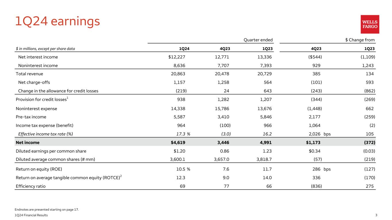 | News Release | April 12, 2024 Wells Fargo Reports First Quarter 2024 Net Income of $4.6 billion, or $1.20 per Diluted Share |