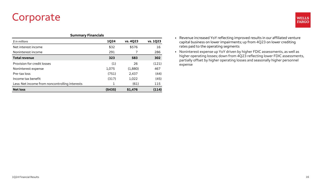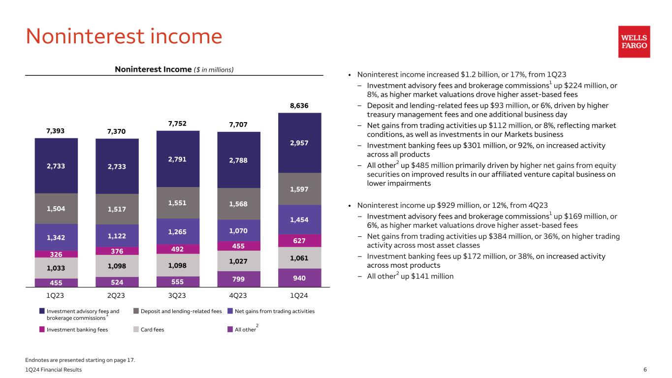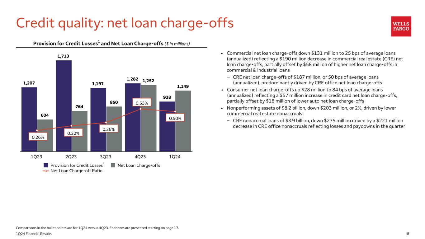 Chief Executive Officer Charlie Scharf commented, “Our solid first quarter results demonstrate the progress we continue to make to improve and diversify our financial performance. The investments we are making across the franchise contributed to higher revenue versus the fourth quarter as an increase in noninterest income more than offset an expected decline in net interest income. Net charge-offs were stable from the fourth quarter as credit trends remained consistent with recent performance, and we repurchased $6.1 billion of common stock while maintaining a strong capital position.”