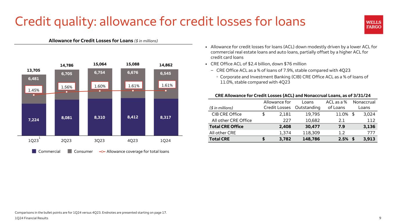 81Q24 Financial Results 1,207 1,713 1,197 1,282 938 604 764 850 1,252 1,149 Provision for Credit Losses Net Loan Charge-offs Net Loan Charge-off Ratio 1Q23 2Q23 3Q23 4Q23 1Q24 Credit quality: net loan charge-offs • Commercial net loan charge-offs down $131 million to 25 bps of average loans (annualized) reflecting a $190 million decrease in commercial real estate (CRE) net loan charge-offs, partially offset by $58 million of higher net loan charge-offs in commercial & industrial loans – CRE net loan charge-offs of $187 million, or 50 bps of average loans (annualized), predominantly driven by CRE office net loan charge-offs • Consumer net loan charge-offs up $28 million to 84 bps of average loans (annualized) reflecting a $57 million increase in credit card net loan charge-offs, partially offset by $18 million of lower auto net loan charge-offs • Nonperforming assets of $8.2 billion, down $203 million, or 2%, driven by lower commercial real estate nonaccruals – CRE nonaccrual loans of $3.9 billion, down $275 million driven by a $221 million decrease in CRE office nonaccruals reflecting losses and paydowns in the quarter Provision for Credit Losses1 and Net Loan Charge-offs ($ in millions) Comparisons in the bullet points are for 1Q24 versus 4Q23. Endnotes are presented starting on page 17. 0.26% 0.32% 0.53% 0.36% 1 0.50%