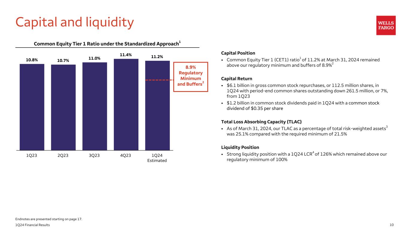 2 Represents our Common Equity Tier 1 (CET1) ratio calculated under the Standardized Approach, which is our binding CET1 ratio. See tables on pages 26-27 of the 1Q24 Quarterly Supplement for more information on CET1. CET1 for March 31, 2024, is a preliminary estimate.