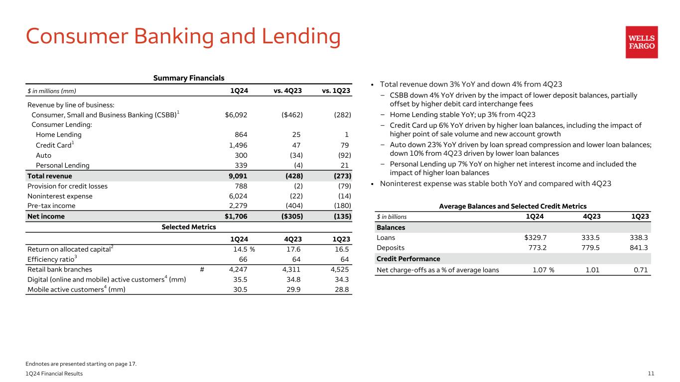 111Q24 Financial Results • Total revenue down 3% YoY and down 4% from 4Q23 – CSBB down 4% YoY driven by the impact of lower deposit balances, partially offset by higher debit card interchange fees – Home Lending stable YoY; up 3% from 4Q23 – Credit Card up 6% YoY driven by higher loan balances, including the impact of higher point of sale volume and new account growth – Auto down 23% YoY driven by loan spread compression and lower loan balances; down 10% from 4Q23 driven by lower loan balances – Personal Lending up 7% YoY on higher net interest income and included the impact of higher loan balances • Noninterest expense was stable both YoY and compared with 4Q23 Consumer Banking and Lending Summary Financials $ in millions (mm) 1Q24 vs. 4Q23 vs. 1Q23 Revenue by line of business: Consumer, Small and Business Banking (CSBB)1 $6,092 ($462) (282) Consumer Lending: Home Lending 864 25 1 Credit Card1 1,496 47 79 Auto 300 (34) (92) Personal Lending 339 (4) 21 Total revenue 9,091 (428) (273) Provision for credit losses 788 (2) (79) Noninterest expense 6,024 (22) (14) Pre-tax income 2,279 (404) (180) Net income $1,706 ($305) (135) Selected Metrics 1Q24 4Q23 1Q23 Return on allocated capital2 14.5 % 17.6 16.5 Efficiency ratio3 66 64 64 Retail bank branches # 4,247 4,311 4,525 Digital (online and mobile) active customers4 (mm) 35.5 34.8 34.3 Mobile active customers4 (mm) 30.5 29.9 28.8 Average Balances and Selected Credit Metrics $ in billions 1Q24 4Q23 1Q23 Balances Loans $329.7 333.5 338.3 Deposits 773.2 779.5 841.3 Credit Performance Net charge-offs as a % of average loans 1.07 % 1.01 0.71 Endnotes are presented starting on page 17.
