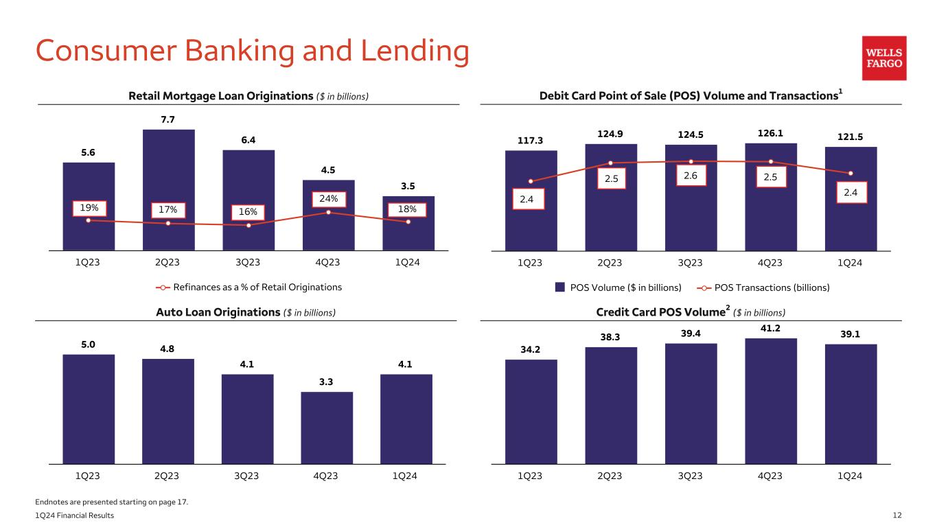 121Q24 Financial Results Consumer Banking and Lending Retail Mortgage Loan Originations ($ in billions) Auto Loan Originations ($ in billions) Credit Card POS Volume2 ($ in billions) Debit Card Point of Sale (POS) Volume and Transactions1 5.6 7.7 6.4 4.5 3.5 Refinances as a % of Retail Originations 1Q23 2Q23 3Q23 4Q23 1Q24 117.3 124.9 124.5 126.1 121.5 POS Volume ($ in billions) POS Transactions (billions) 1Q23 2Q23 3Q23 4Q23 1Q24 5.0 4.8 4.1 3.3 4.1 1Q23 2Q23 3Q23 4Q23 1Q24 34.2 38.3 39.4 41.2 39.1 1Q23 2Q23 3Q23 4Q23 1Q24 2.4 2.5 2.6 2.5 2.4 19% 17% 16% 24% 18% Endnotes are presented starting on page 17.