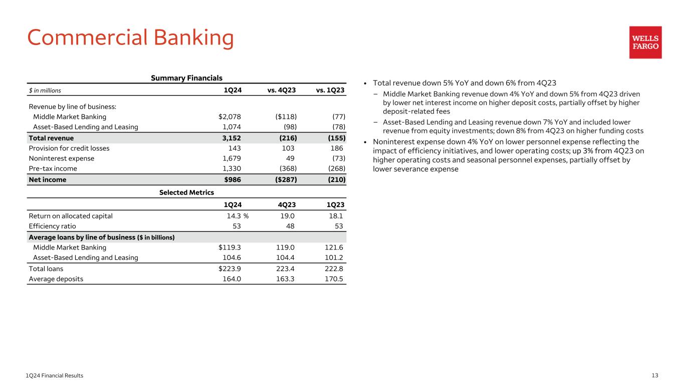 131Q24 Financial Results Commercial Banking • Total revenue down 5% YoY and down 6% from 4Q23 – Middle Market Banking revenue down 4% YoY and down 5% from 4Q23 driven by lower net interest income on higher deposit costs, partially offset by higher deposit-related fees – Asset-Based Lending and Leasing revenue down 7% YoY and included lower revenue from equity investments; down 8% from 4Q23 on higher funding costs • Noninterest expense down 4% YoY on lower personnel expense reflecting the impact of efficiency initiatives, and lower operating costs; up 3% from 4Q23 on higher operating costs and seasonal personnel expenses, partially offset by lower severance expense Summary Financials $ in millions 1Q24 vs. 4Q23 vs. 1Q23 Revenue by line of business: Middle Market Banking $2,078 ($118) (77) Asset-Based Lending and Leasing 1,074 (98) (78) Total revenue 3,152 (216) (155) Provision for credit losses 143 103 186 Noninterest expense 1,679 49 (73) Pre-tax income 1,330 (368) (268) Net income $986 ($287) (210) Selected Metrics 1Q24 4Q23 1Q23 Return on allocated capital 14.3 % 19.0 18.1 Efficiency ratio 53 48 53 Average loans by line of business ($ in billions) Middle Market Banking $119.3 119.0 121.6 Asset-Based Lending and Leasing 104.6 104.4 101.2 Total loans $223.9 223.4 222.8 Average deposits 164.0 163.3 170.5