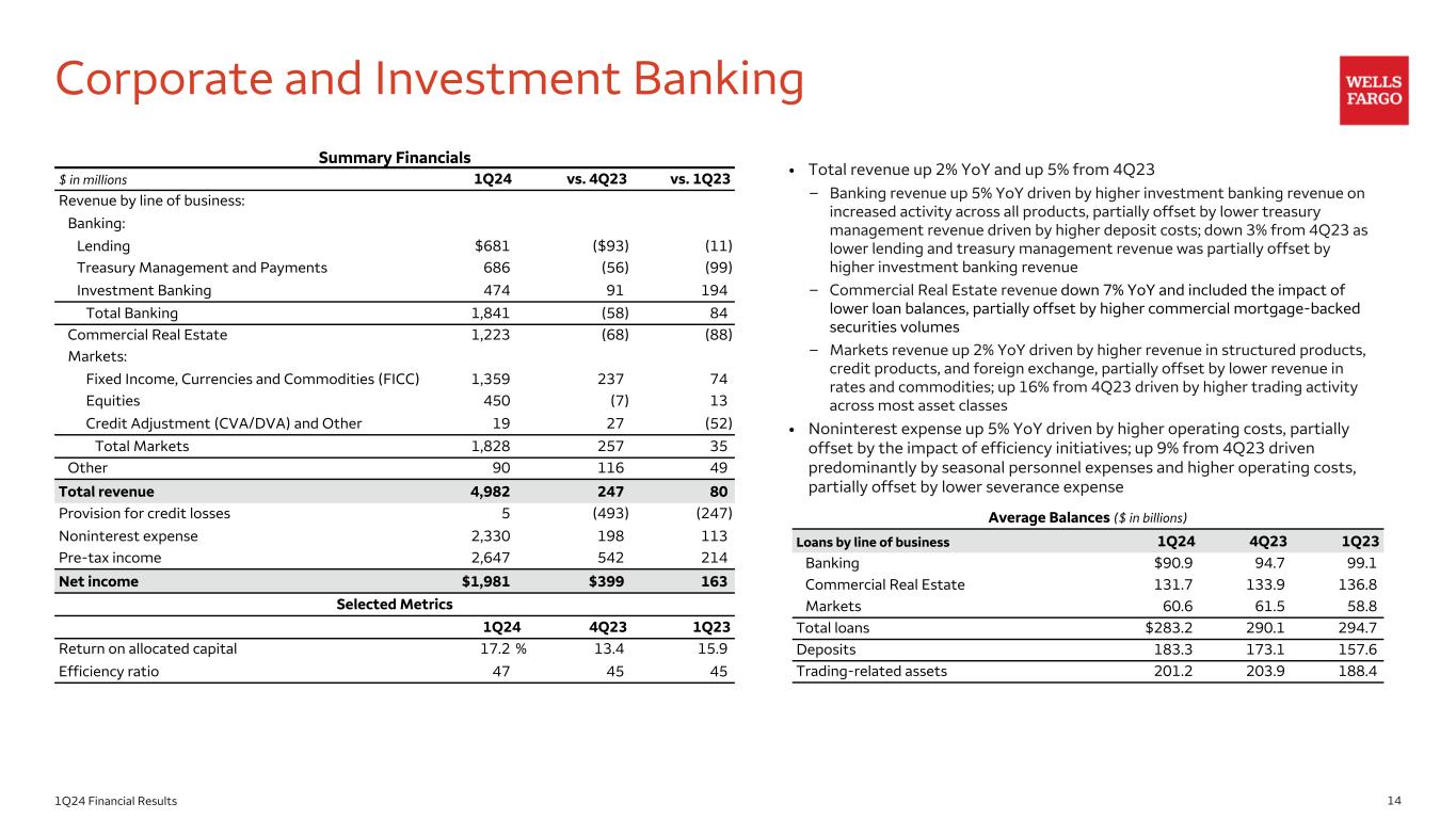 141Q24 Financial Results Corporate and Investment Banking • Total revenue up 2% YoY and up 5% from 4Q23 – Banking revenue up 5% YoY driven by higher investment banking revenue on increased activity across all products, partially offset by lower treasury management revenue driven by higher deposit costs; down 3% from 4Q23 as lower lending and treasury management revenue was partially offset by higher investment banking revenue – Commercial Real Estate revenue down 7% YoY and included the impact of lower loan balances, partially offset by higher commercial mortgage-backed securities volumes – Markets revenue up 2% YoY driven by higher revenue in structured products, credit products, and foreign exchange, partially offset by lower revenue in rates and commodities; up 16% from 4Q23 driven by higher trading activity across most asset classes • Noninterest expense up 5% YoY driven by higher operating costs, partially offset by the impact of efficiency initiatives; up 9% from 4Q23 driven predominantly by seasonal personnel expenses and higher operating costs, partially offset by lower severance expense Summary Financials $ in millions 1Q24 vs. 4Q23 vs. 1Q23 Revenue by line of business: Banking: Lending $681 ($93) (11) Treasury Management and Payments 686 (56) (99) Investment Banking 474 91 194 Total Banking 1,841 (58) 84 Commercial Real Estate 1,223 (68) (88) Markets: Fixed Income, Currencies and Commodities (FICC) 1,359 237 74 Equities 450 (7) 13 Credit Adjustment (CVA/DVA) and Other 19 27 (52) Total Markets 1,828 257 35 Other 90 116 49 Total revenue 4,982 247 80 Provision for credit losses 5 (493) (247) Noninterest expense 2,330 198 113 Pre-tax income 2,647 542 214 Net income $1,981 $399 163 Selected Metrics 1Q24 4Q23 1Q23 Return on allocated capital 17.2 % 13.4 15.9 Efficiency ratio 47 45 45 Average Balances ($ in billions) Loans by line of business 1Q24 4Q23 1Q23 Banking $90.9 94.7 99.1 Commercial Real Estate 131.7 133.9 136.8 Markets 60.6 61.5 58.8 Total loans $283.2 290.1 294.7 Deposits 183.3 173.1 157.6 Trading-related assets 201.2 203.9 188.4