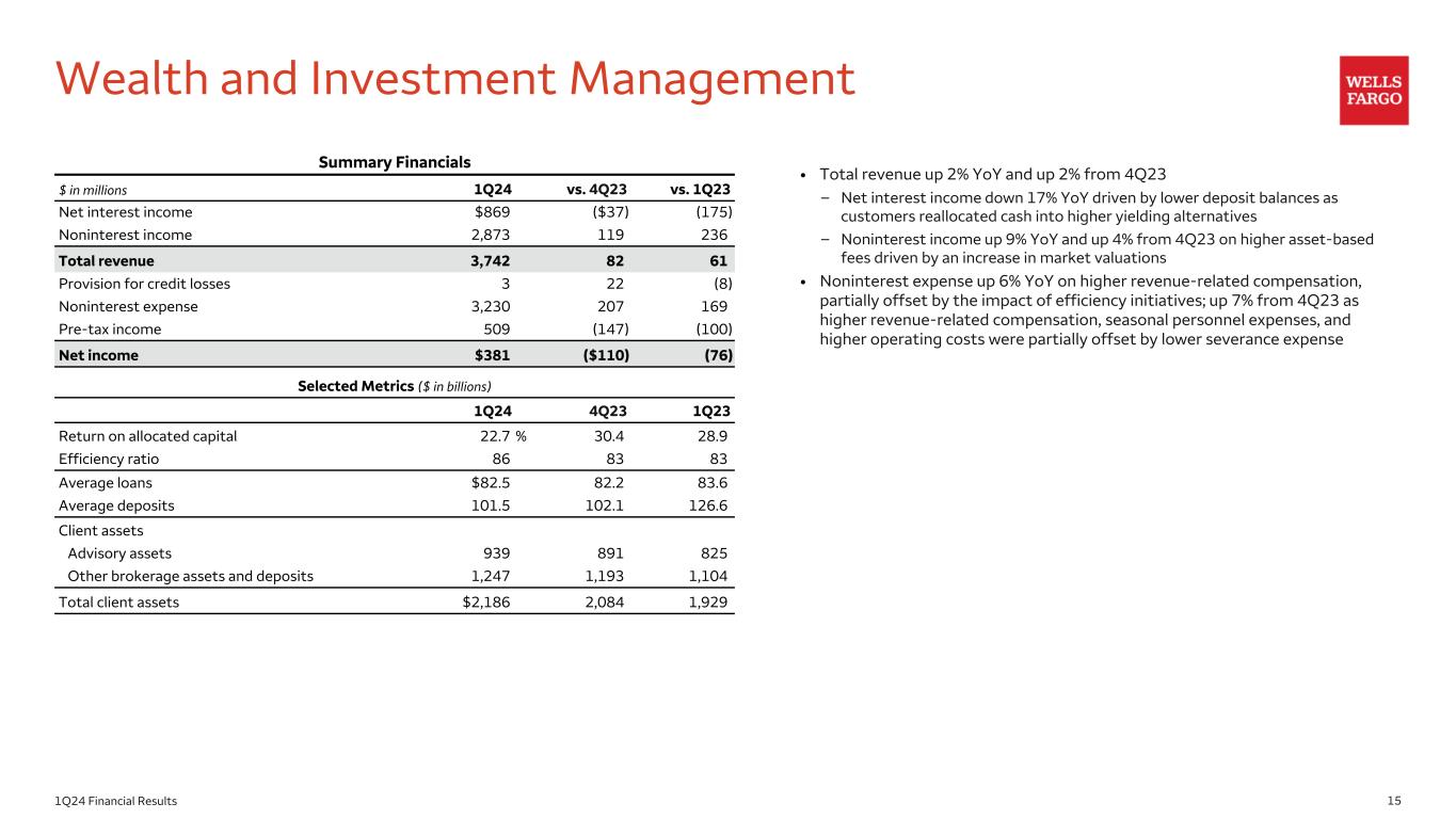 151Q24 Financial Results Wealth and Investment Management Summary Financials $ in millions 1Q24 vs. 4Q23 vs. 1Q23 Net interest income $869 ($37) (175) Noninterest income 2,873 119 236 Total revenue 3,742 82 61 Provision for credit losses 3 22 (8) Noninterest expense 3,230 207 169 Pre-tax income 509 (147) (100) Net income $381 ($110) (76) Selected Metrics ($ in billions) 1Q24 4Q23 1Q23 Return on allocated capital 22.7 % 30.4 28.9 Efficiency ratio 86 83 83 Average loans $82.5 82.2 83.6 Average deposits 101.5 102.1 126.6 Client assets Advisory assets 939 891 825 Other brokerage assets and deposits 1,247 1,193 1,104 Total client assets $2,186 2,084 1,929 • Total revenue up 2% YoY and up 2% from 4Q23 – Net interest income down 17% YoY driven by lower deposit balances as customers reallocated cash into higher yielding alternatives – Noninterest income up 9% YoY and up 4% from 4Q23 on higher asset-based fees driven by an increase in market valuations • Noninterest expense up 6% YoY on higher revenue-related compensation, partially offset by the impact of efficiency initiatives; up 7% from 4Q23 as higher revenue-related compensation, seasonal personnel expenses, and higher operating costs were partially offset by lower severance expense