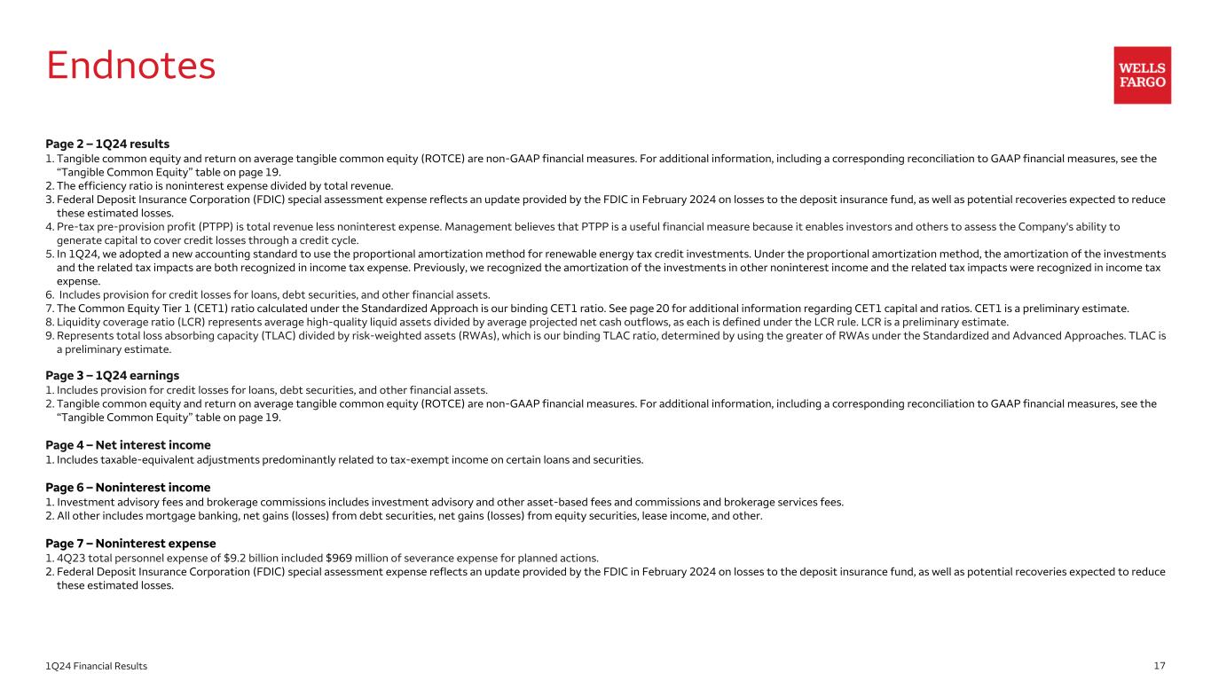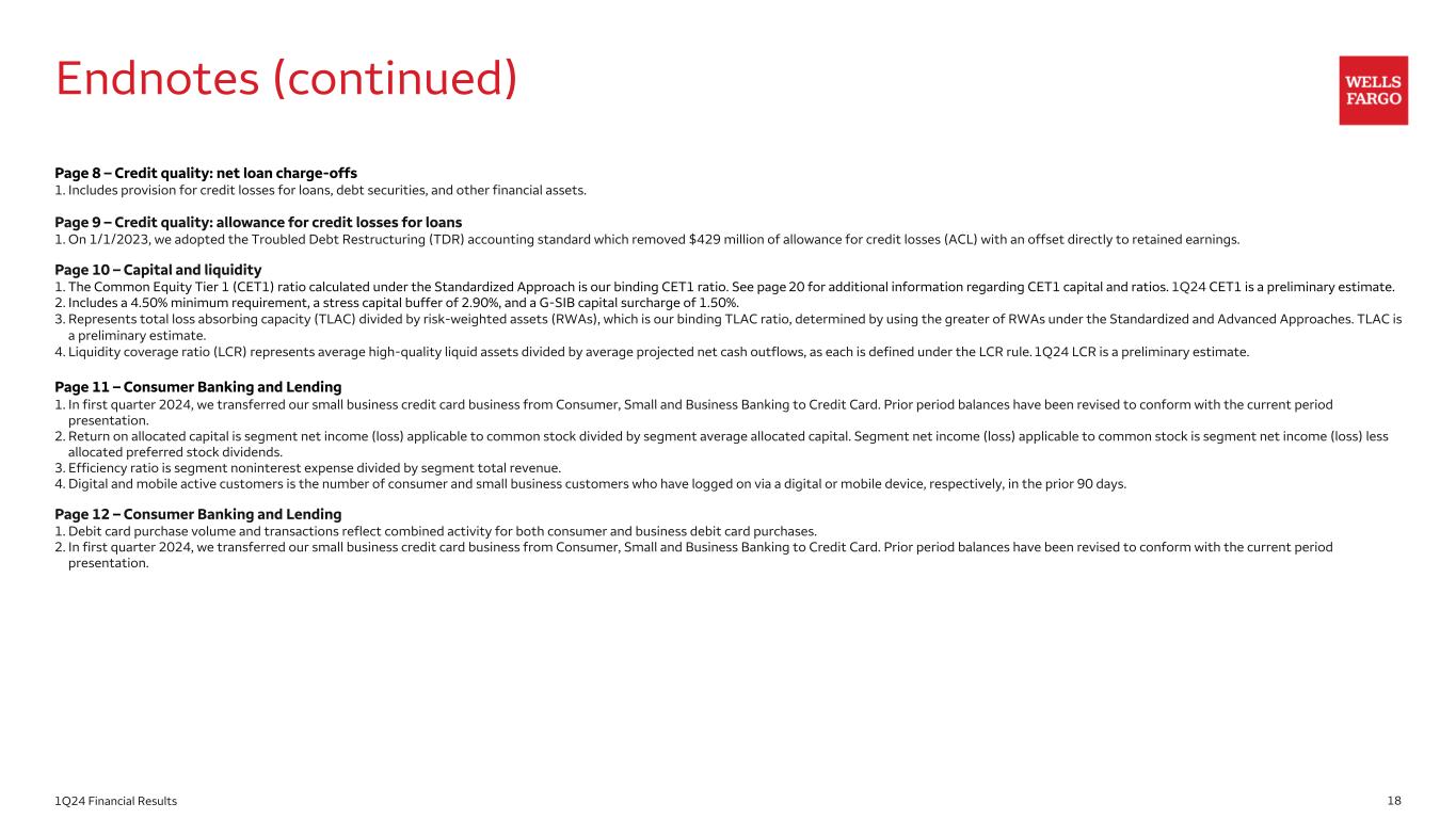 181Q24 Financial Results Endnotes (continued) Page 8 – Credit quality: net loan charge-offs 1. Includes provision for credit losses for loans, debt securities, and other financial assets. Page 9 – Credit quality: allowance for credit losses for loans 1. On 1/1/2023, we adopted the Troubled Debt Restructuring (TDR) accounting standard which removed $429 million of allowance for credit losses (ACL) with an offset directly to retained earnings. Page 10 – Capital and liquidity 1. The Common Equity Tier 1 (CET1) ratio calculated under the Standardized Approach is our binding CET1 ratio. See page 20 for additional information regarding CET1 capital and ratios. 1Q24 CET1 is a preliminary estimate. 2. Includes a 4.50% minimum requirement, a stress capital buffer of 2.90%, and a G-SIB capital surcharge of 1.50%. 3. Represents total loss absorbing capacity (TLAC) divided by risk-weighted assets (RWAs), which is our binding TLAC ratio, determined by using the greater of RWAs under the Standardized and Advanced Approaches. TLAC is a preliminary estimate. 4. Liquidity coverage ratio (LCR) represents average high-quality liquid assets divided by average projected net cash outflows, as each is defined under the LCR rule. 1Q24 LCR is a preliminary estimate. Page 11 – Consumer Banking and Lending 1. In first quarter 2024, we transferred our small business credit card business from Consumer, Small and Business Banking to Credit Card. Prior period balances have been revised to conform with the current period presentation. 2. Return on allocated capital is segment net income (loss) applicable to common stock divided by segment average allocated capital. Segment net income (loss) applicable to common stock is segment net income (loss) less allocated preferred stock dividends. 3. Efficiency ratio is segment noninterest expense divided by segment total revenue. 4. Digital and mobile active customers is the number of consumer and small business customers who have logged on via a digital or mobile device, respectively, in the prior 90 days. Page 12 – Consumer Banking and Lending 1. Debit card purchase volume and transactions reflect combined activity for both consumer and business debit card purchases. 2. In first quarter 2024, we transferred our small business credit card business from Consumer, Small and Business Banking to Credit Card. Prior period balances have been revised to conform with the current period presentation.