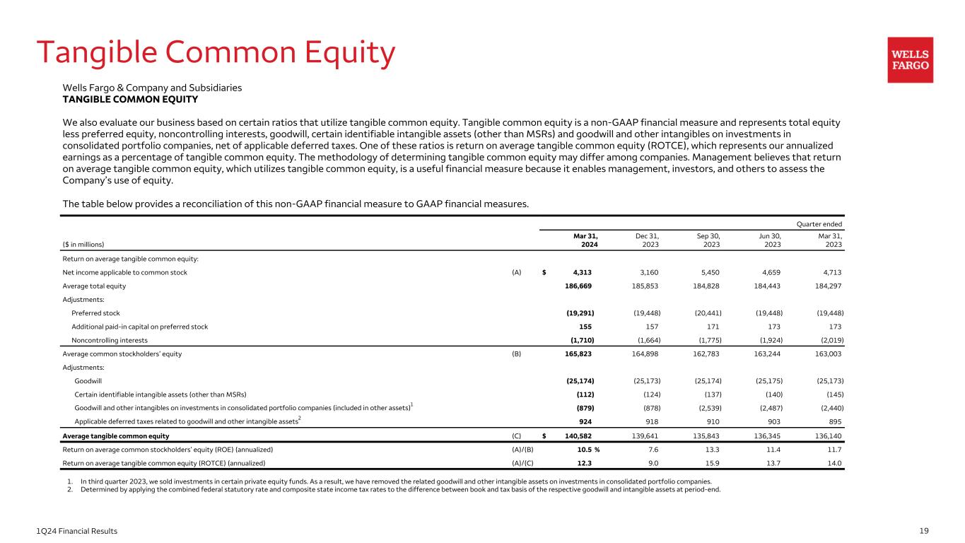 191Q24 Financial Results Tangible Common Equity Wells Fargo & Company and Subsidiaries TANGIBLE COMMON EQUITY We also evaluate our business based on certain ratios that utilize tangible common equity. Tangible common equity is a non-GAAP financial measure and represents total equity less preferred equity, noncontrolling interests, goodwill, certain identifiable intangible assets (other than MSRs) and goodwill and other intangibles on investments in consolidated portfolio companies, net of applicable deferred taxes. One of these ratios is return on average tangible common equity (ROTCE), which represents our annualized earnings as a percentage of tangible common equity. The methodology of determining tangible common equity may differ among companies. Management believes that return on average tangible common equity, which utilizes tangible common equity, is a useful financial measure because it enables management, investors, and others to assess the Company’s use of equity. The table below provides a reconciliation of this non-GAAP financial measure to GAAP financial measures. Quarter ended ($ in millions) Mar 31, 2024 Dec 31, 2023 Sep 30, 2023 Jun 30, 2023 Mar 31, 2023 Return on average tangible common equity: Net income applicable to common stock (A) $ 4,313 3,160 5,450 4,659 4,713 Average total equity 186,669 185,853 184,828 184,443 184,297 Adjustments: Preferred stock (19,291) (19,448) (20,441) (19,448) (19,448) Additional paid-in capital on preferred stock 155 157 171 173 173 Noncontrolling interests (1,710) (1,664) (1,775) (1,924) (2,019) Average common stockholders’ equity (B) 165,823 164,898 162,783 163,244 163,003 Adjustments: Goodwill (25,174) (25,173) (25,174) (25,175) (25,173) Certain identifiable intangible assets (other than MSRs) (112) (124) (137) (140) (145) Goodwill and other intangibles on investments in consolidated portfolio companies (included in other assets)1 (879) (878) (2,539) (2,487) (2,440) Applicable deferred taxes related to goodwill and other intangible assets2 924 918 910 903 895 Average tangible common equity (C) $ 140,582 139,641 135,843 136,345 136,140 Return on average common stockholders’ equity (ROE) (annualized) (A)/(B) 10.5 % 7.6 13.3 11.4 11.7 Return on average tangible common equity (ROTCE) (annualized) (A)/(C) 12.3 9.0 15.9 13.7 14.0 1. In third quarter 2023, we sold investments in certain private equity funds. As a result, we have removed the related goodwill and other intangible assets on investments in consolidated portfolio companies. 2. Determined by applying the combined federal statutory rate and composite state income tax rates to the difference between book and tax basis of the respective goodwill and intangible assets at period-end.