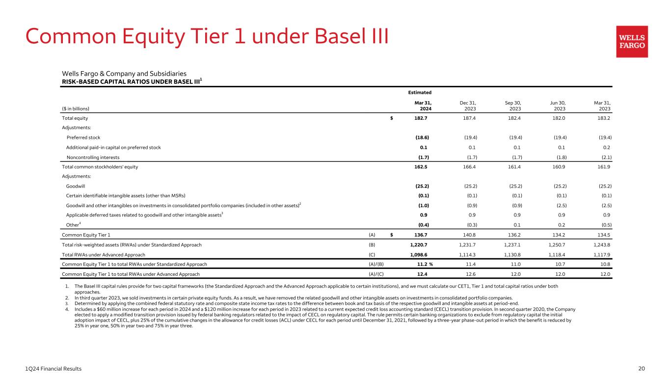 201Q24 Financial Results 1. The Basel III capital rules provide for two capital frameworks (the Standardized Approach and the Advanced Approach applicable to certain institutions), and we must calculate our CET1, Tier 1 and total capital ratios under both approaches. 2. In third quarter 2023, we sold investments in certain private equity funds. As a result, we have removed the related goodwill and other intangible assets on investments in consolidated portfolio companies. 3. Determined by applying the combined federal statutory rate and composite state income tax rates to the difference between book and tax basis of the respective goodwill and intangible assets at period-end. 4. Includes a $60 million increase for each period in 2024 and a $120 million increase for each period in 2023 related to a current expected credit loss accounting standard (CECL) transition provision. In second quarter 2020, the Company elected to apply a modified transition provision issued by federal banking regulators related to the impact of CECL on regulatory capital. The rule permits certain banking organizations to exclude from regulatory capital the initial adoption impact of CECL, plus 25% of the cumulative changes in the allowance for credit losses (ACL) under CECL for each period until December 31, 2021, followed by a three-year phase-out period in which the benefit is reduced by 25% in year one, 50% in year two and 75% in year three. Common Equity Tier 1 under Basel III Wells Fargo & Company and Subsidiaries RISK-BASED CAPITAL RATIOS UNDER BASEL III1 Estimated ($ in billions) Mar 31, 2024 Dec 31, 2023 Sep 30, 2023 Jun 30, 2023 Mar 31, 2023 Total equity $ 182.7 187.4 182.4 182.0 183.2 Adjustments: Preferred stock (18.6) (19.4) (19.4) (19.4) (19.4) Additional paid-in capital on preferred stock 0.1 0.1 0.1 0.1 0.2 Noncontrolling interests (1.7) (1.7) (1.7) (1.8) (2.1) Total common stockholders' equity 162.5 166.4 161.4 160.9 161.9 Adjustments: Goodwill (25.2) (25.2) (25.2) (25.2) (25.2) Certain identifiable intangible assets (other than MSRs) (0.1) (0.1) (0.1) (0.1) (0.1) Goodwill and other intangibles on investments in consolidated portfolio companies (included in other assets)2 (1.0) (0.9) (0.9) (2.5) (2.5) Applicable deferred taxes related to goodwill and other intangible assets3 0.9 0.9 0.9 0.9 0.9 Other4 (0.4) (0.3) 0.1 0.2 (0.5) Common Equity Tier 1 (A) $ 136.7 140.8 136.2 134.2 134.5 Total risk-weighted assets (RWAs) under Standardized Approach (B) 1,220.7 1,231.7 1,237.1 1,250.7 1,243.8 Total RWAs under Advanced Approach (C) 1,098.6 1,114.3 1,130.8 1,118.4 1,117.9 Common Equity Tier 1 to total RWAs under Standardized Approach (A)/(B) 11.2 % 11.4 11.0 10.7 10.8 Common Equity Tier 1 to total RWAs under Advanced Approach (A)/(C) 12.4 12.6 12.0 12.0 12.0