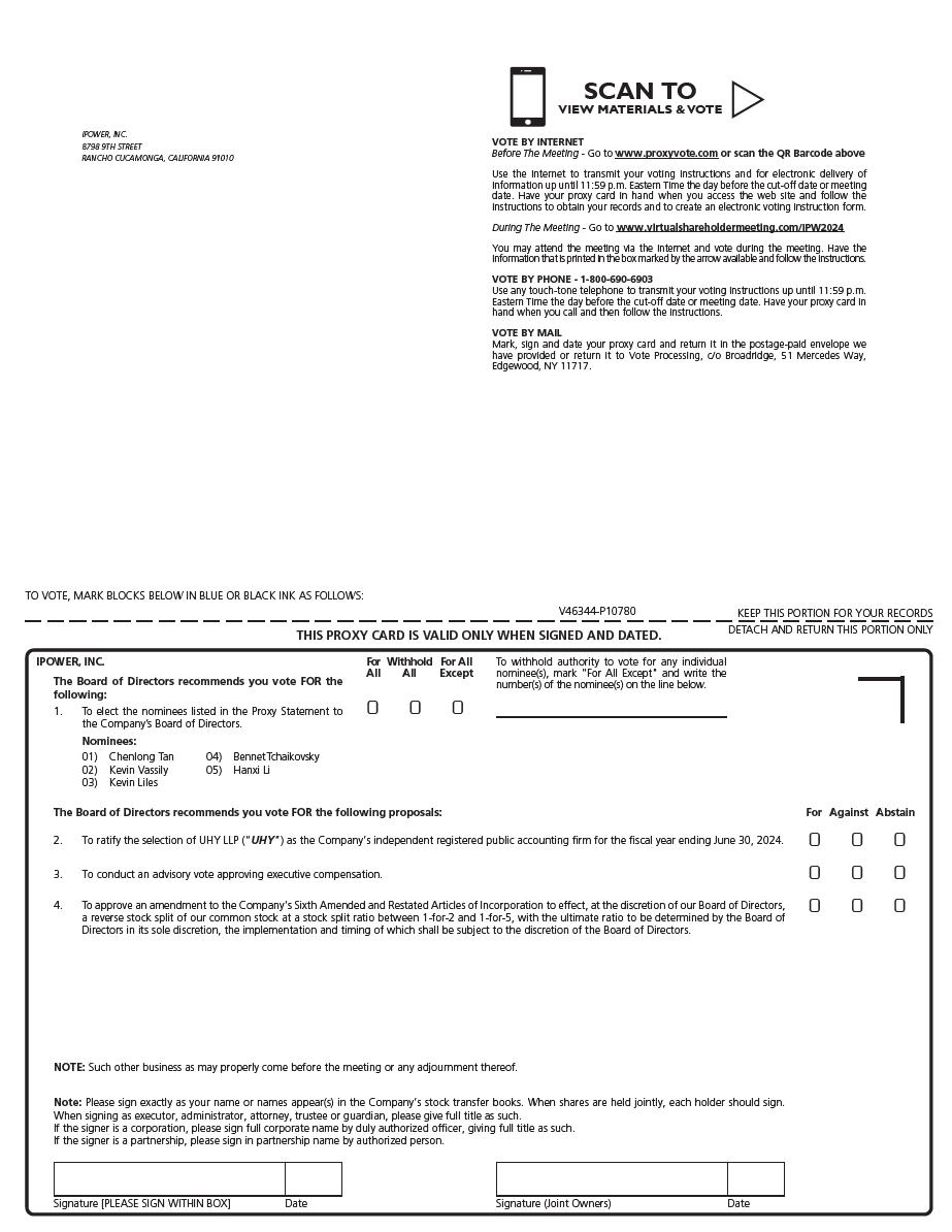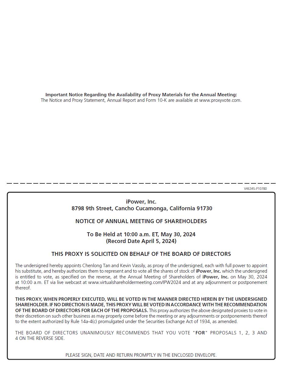 The Annual Meeting of the shareholders of iPower Inc., a Nevada corporation (“Company”), will be held on May 30, 2024, at 10:00 a.m. (ET), and will be accessible virtually at www.virtualshareholdermeeting.com/IPW2024, for the following purposes: