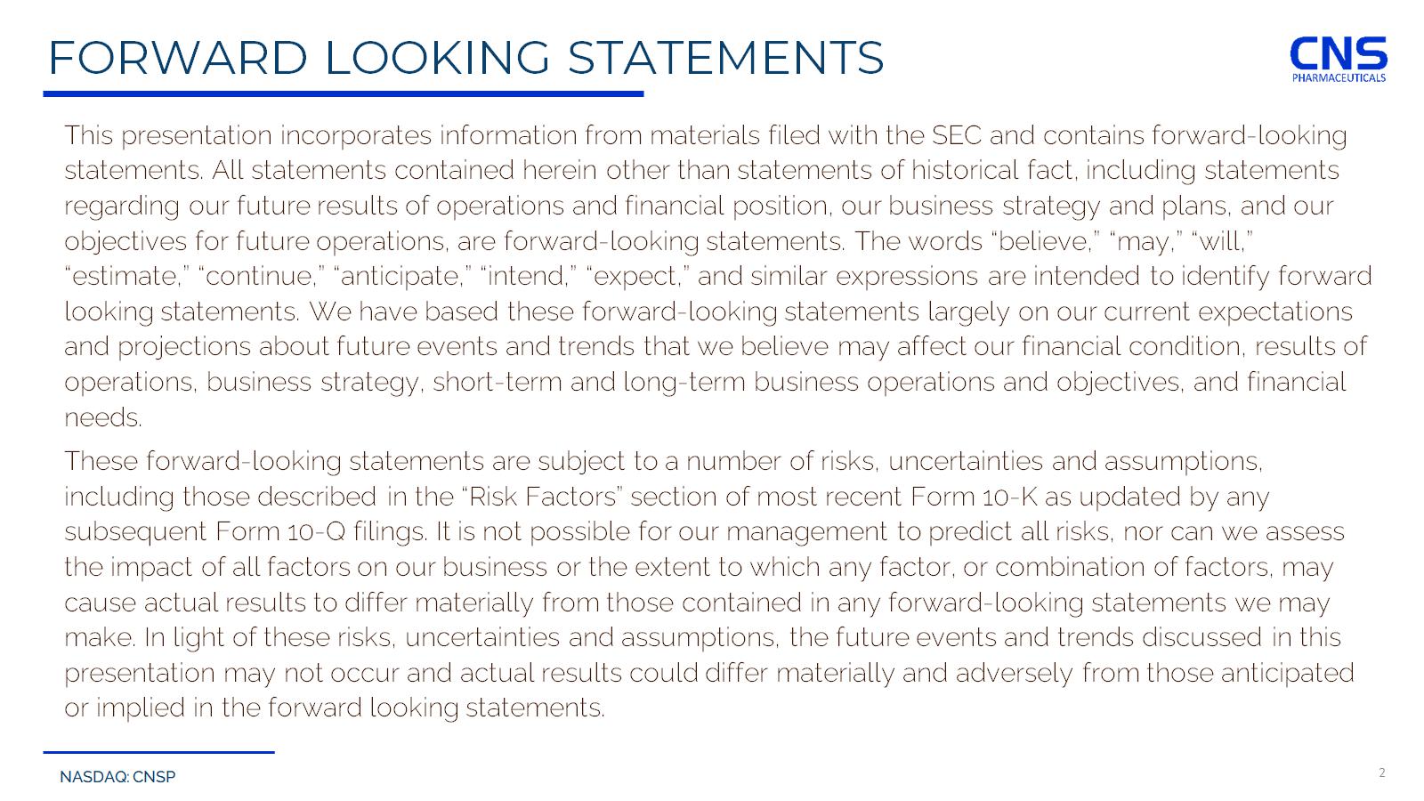 NASDAQ: CNSP This presentation incorporates information from materials filed with the SEC and contains forward - looking statements. All statements contained herein other than statements of historical fact, including statements regarding our future results of operations and financial position, our business strategy and plans, and our objectives for future operations, are forward - looking statements. The words “believe,” “may,” “will,” “estimate,” “continue,” “anticipate,” “intend,” “expect,” and similar expressions are intended to identify forward looking statements. We have based these forward - looking statements largely on our current expectations and projections about future events and trends that we believe may affect our financial condition, results of operations, business strategy, short - term and long - term business operations and objectives, and financial needs. These forward - looking statements are subject to a number of risks, uncertainties and assumptions, including those described in the “Risk Factors” section of most recent Form 10 - K as updated by any subsequent Form 10 - Q filings. It is not possible for our management to predict all risks, nor can we assess the impact of all factors on our business or the extent to which any factor, or combination of factors, may cause actual results to differ materially from those contained in any forward - looking statements we may make. In light of these risks, uncertainties and assumptions, the future events and trends discussed in this presentation may not occur and actual results could differ materially and adversely from those anticipated or implied in the forward looking statements. 2 FORWARD LOOKING STATEMENTS