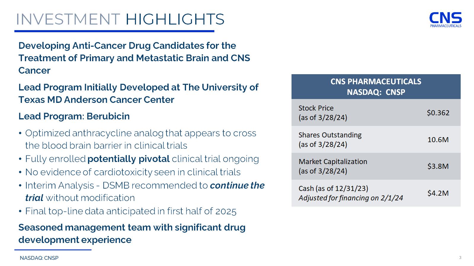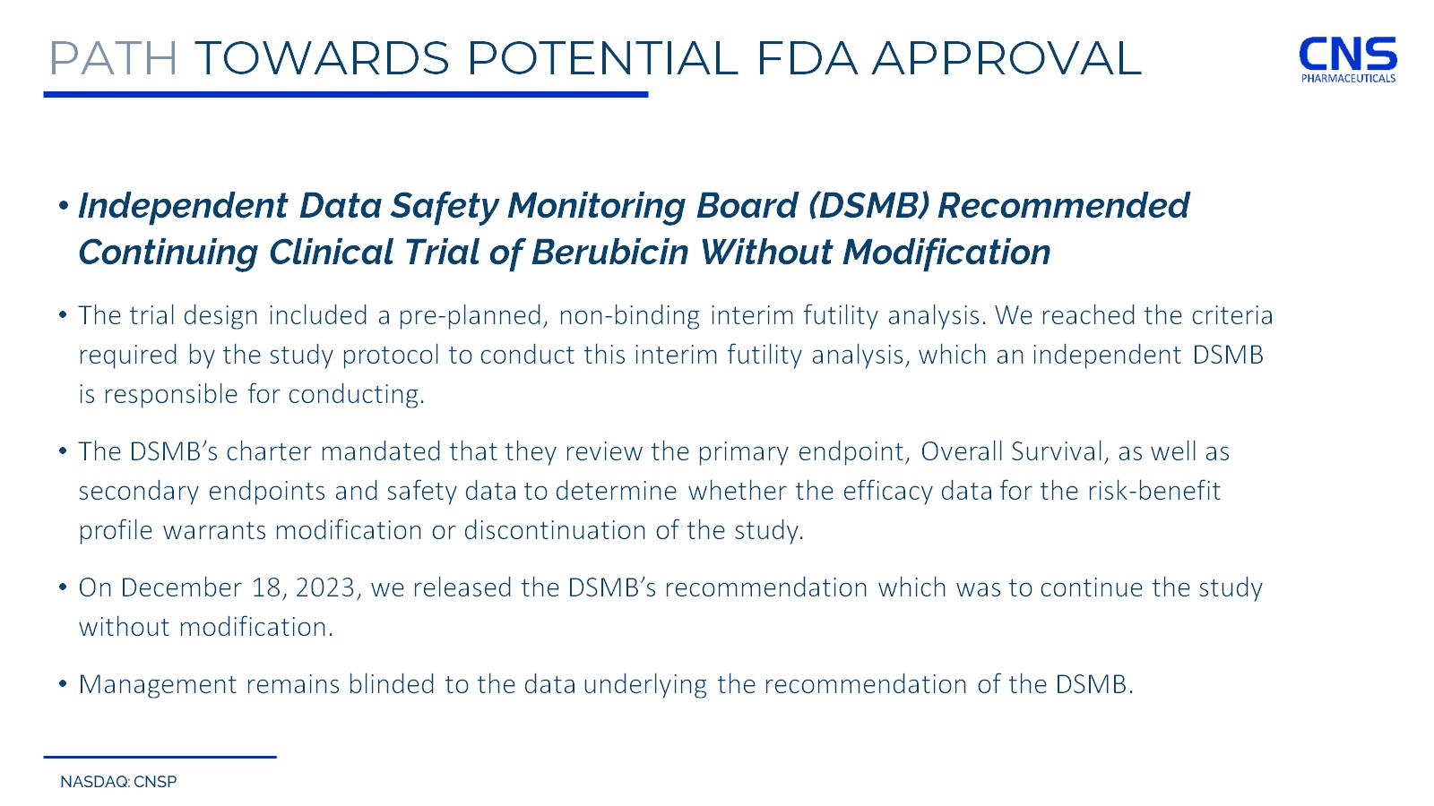 NASDAQ: CNSP PATH TOWARDS POTENTIAL FDA APPROVAL • Independent Data Safety Monitoring Board (DSMB) Recommended Continuing Clinical Trial of Berubicin Without Modification • The trial design included a pre - planned, non - binding interim futility analysis. We reached the criteria required by the study protocol to conduct this interim futility analysis, which an independent DSMB is responsible for conducting. • The DSMB’s charter mandated that they review the primary endpoint, Overall Survival, as well as secondary endpoints and safety data to determine whether the efficacy data for the risk - benefit profile warrants modification or discontinuation of the study. • On December 18, 2023, we released the DSMB’s recommendation which was to continue the study without modification. • Management remains blinded to the data underlying the recommendation of the DSMB.