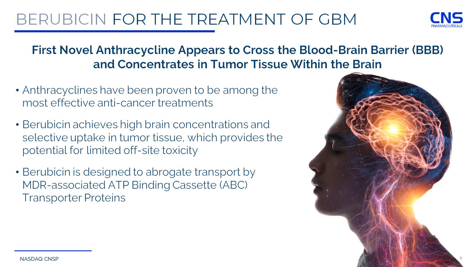 NASDAQ: CNSP 5 THE BLOOD BRAIN BARRIER (BBB) A Tight Layer of Highly Specialized Cells Surrounding the Brain that Prevent Harmful Substances from Penetrating into the Brain • Previously studied anthracyclines have shown no efficacy in brain tumors due to their inability to cross the blood - brain barrier • Berubicin is a next generation anthracycline that appears to cross the blood brain barrier and kill tumor cells in the brain • This represents a potentially new treatment for patients with glioblastoma multiforme (GBM), an aggressive and currently incurable form of brain cancer Current Anthracyclines Berubicin