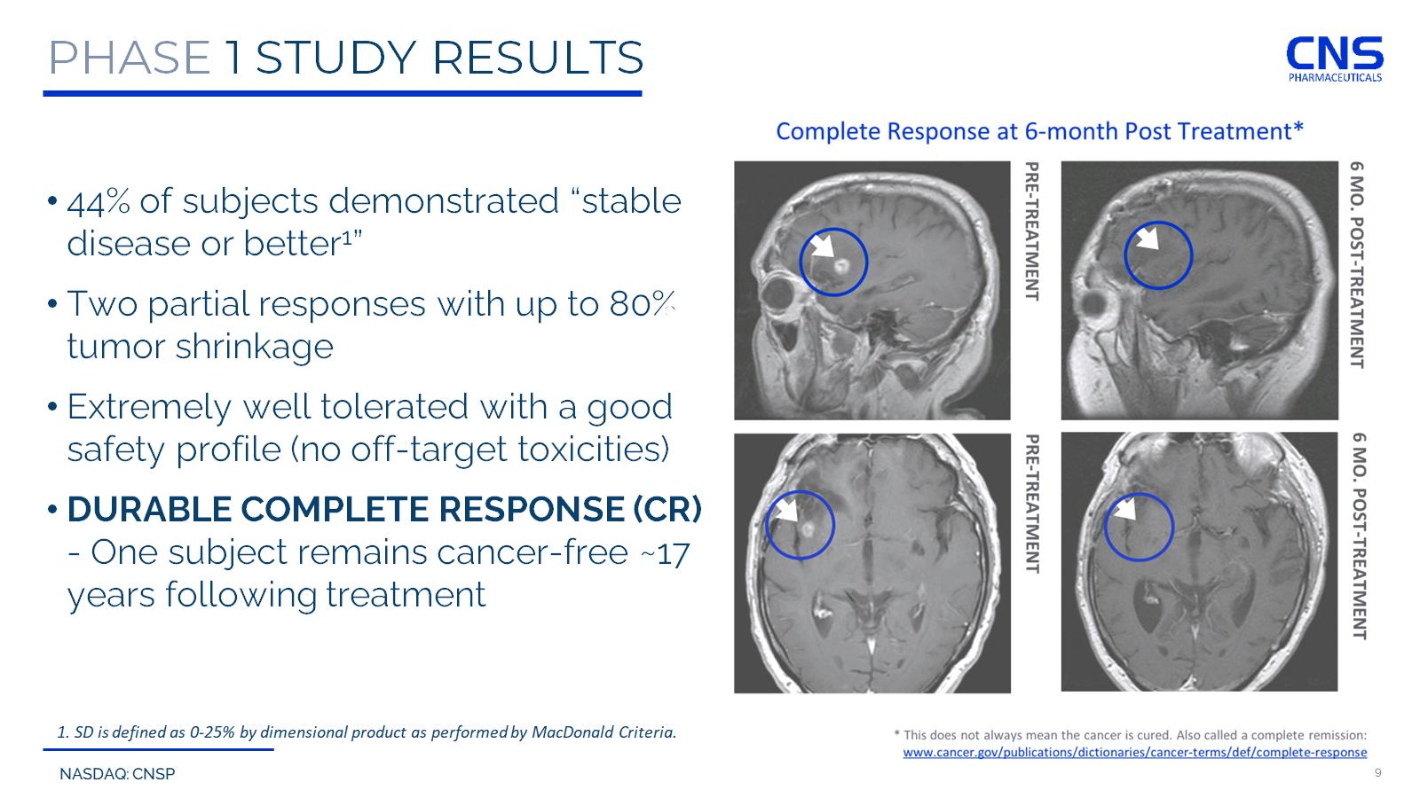 NASDAQ: CNSP 9 PHASE 1 STUDY RESULTS • 44% of subjects demonstrated “stable disease or better 1 ” • Two partial responses with up to 80% tumor shrinkage • Extremely well tolerated with a good safety profile (no off - target toxicities) • DURABLE COMPLETE RESPONSE (CR) - One subject remains cancer - free ~17 years following treatment 1. SD is defined as 0 - 25% by dimensional product as performed by MacDonald Criteria.