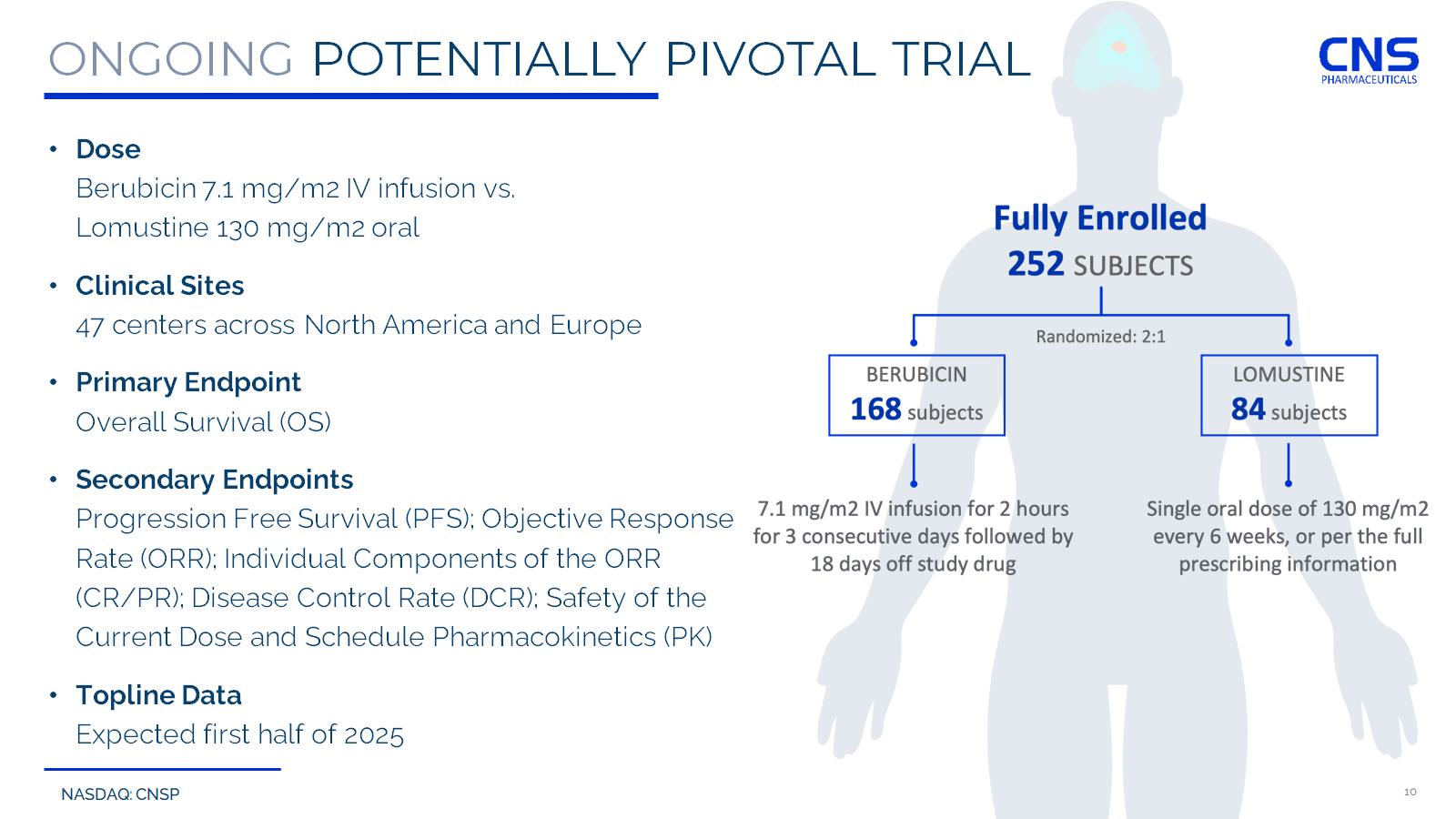 NASDAQ: CNSP UPCOMING VALUE DRIVING MILESTONES Berubicin x Orphan Drug Designation June 2020 x IND Accepted for Berubicin Dec 2020 x Initiated Potentially Pivotal Global Berubicin trial for GBM May 2021 x Fast Track Designation June 2021 x Patient Dosing in Potentially Pivotal Study Expected to Commence Sept 2021 x Approval from Switzerland EC and CA to Open Sites April 2022 x Approval from France EC and CA to Open Sites April 2022 x Approval from Spain EC and CA to Open Sites April 2022 x Pivotal Trial Expansion into France and Spain Sept 2022 x Enrollment of 200 th Patient Sept 2023 x Enrollment of 229 th Patient Oct 2023 x Successful Interim Analysis/Data Dec 2023 x Completion of Planned Enrollment Jan 2024 Next Steps • Target Topline Results from Potentially Pivotal Study H1 2025