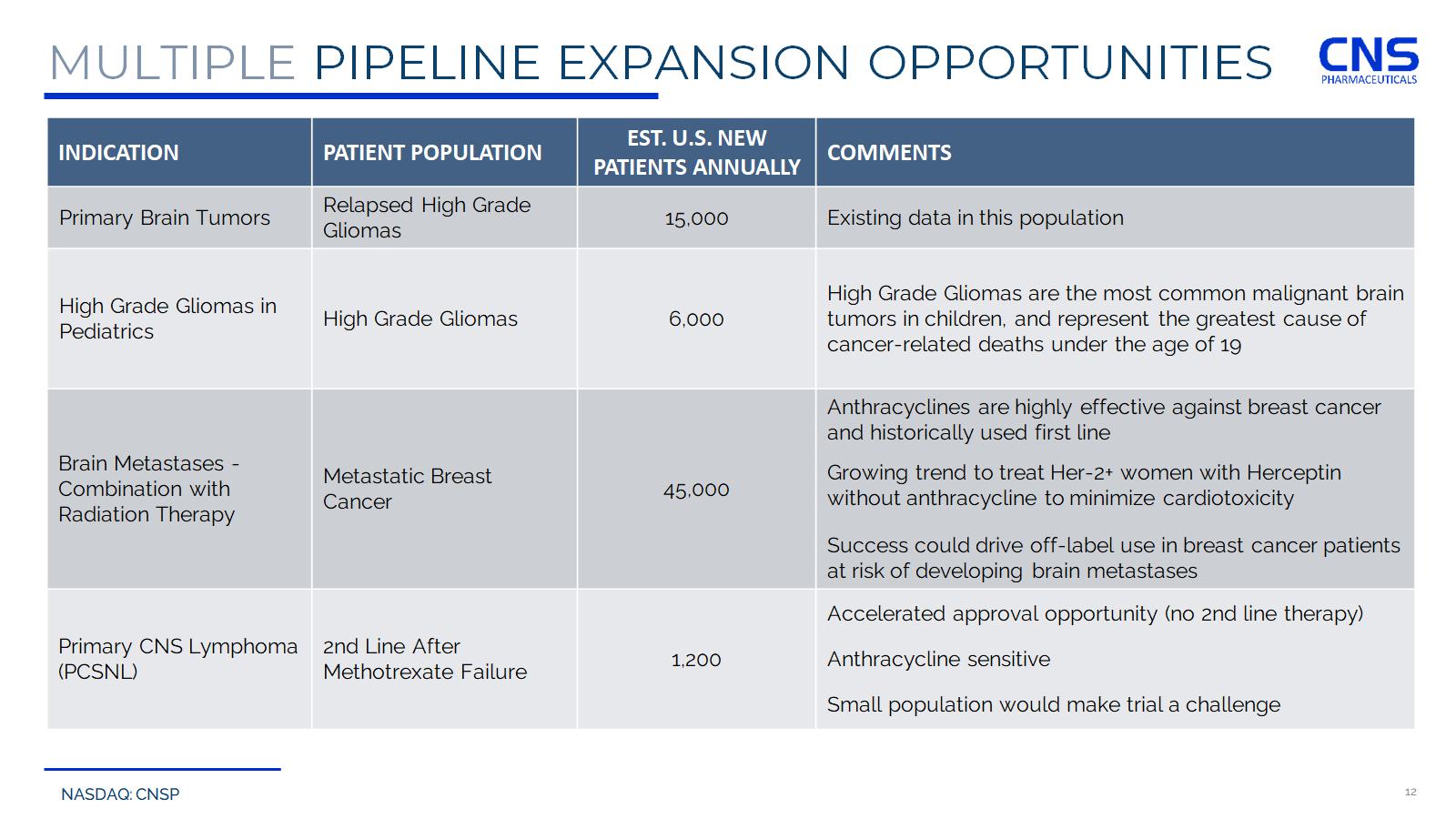 NASDAQ: CNSP 12 MULTIPLE PIPELINE EXPANSION OPPORTUNITIES COMMENTS EST. U.S. NEW PATIENTS ANNUALLY PATIENT POPULATION INDICATION Existing data in this population 15,000 Relapsed High Grade Gliomas Primary Brain Tumors High Grade Gliomas are the most common malignant brain tumors in children, and represent the greatest cause of cancer - related deaths under the age of 19 6,000 High Grade Gliomas High Grade Gliomas in Pediatrics Anthracyclines are highly effective against breast cancer and historically used first line Growing trend to treat Her - 2+ women with Herceptin without anthracycline to minimize cardiotoxicity Success could drive off - label use in breast cancer patients at risk of developing brain metastases 45,000 Metastatic Breast Cancer Brain Metastases - Combination with Radiation Therapy Accelerated approval opportunity (no 2nd line therapy) Anthracycline sensitive Small population would make trial a challenge 1,200 2nd Line After Methotrexate Failure Primary CNS Lymphoma (PCSNL)