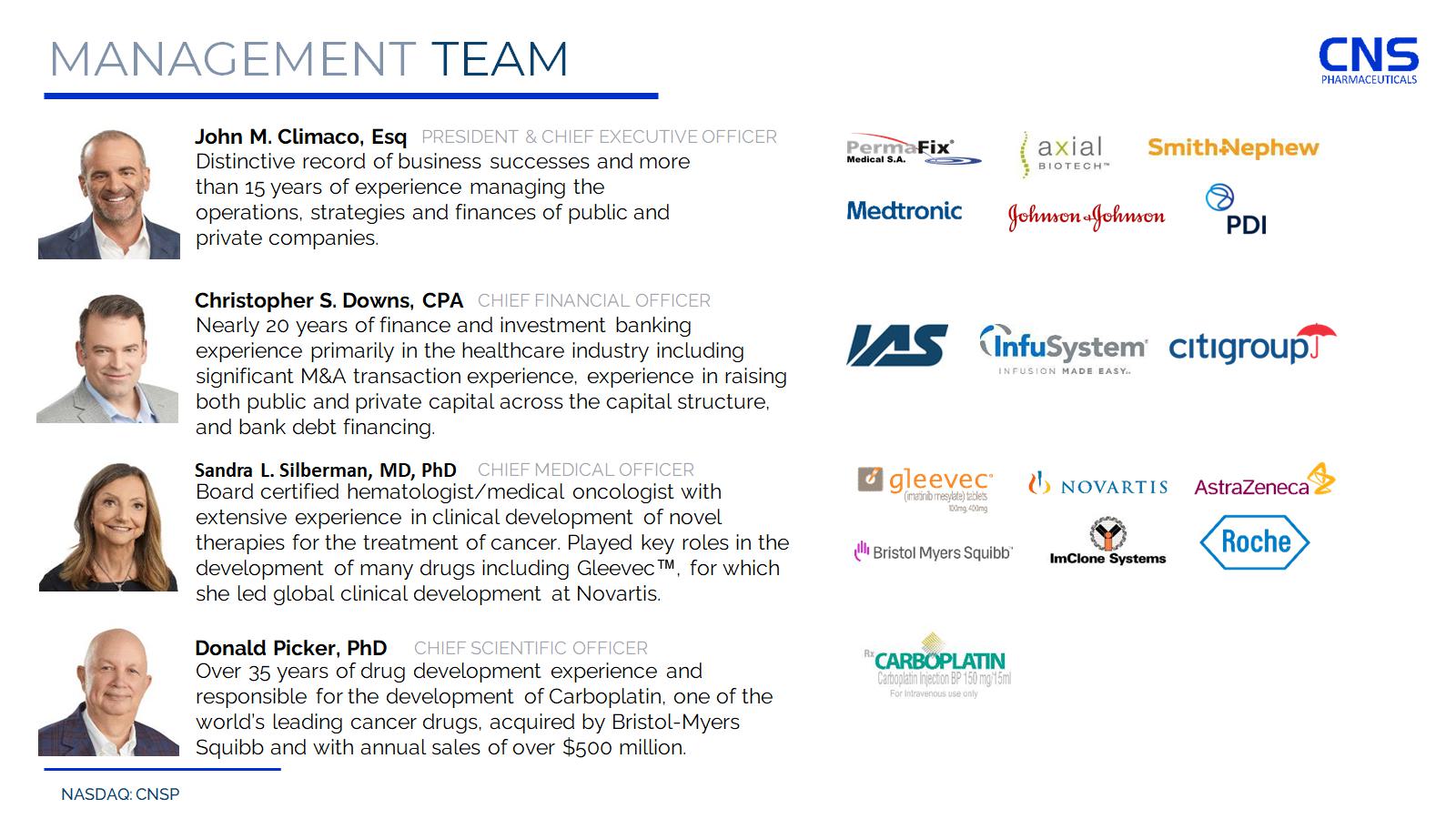 NASDAQ: CNSP MANAGEMENT TEAM Distinctive record of business successes and more than 15 years of experience managing the operations, strategies and finances of public and private companies. PRESIDENT & CHIEF EXECUTIVE OFFICER John M. Climaco , Esq Over 35 years of drug development experience and responsible for the development of Carboplatin, one of the world’s leading cancer drugs, acquired by Bristol - Myers Squibb and with annual sales of over $500 million. CHIEF SCIENTIFIC OFFICER Donald Picker, PhD Board certified hematologist/medical oncologist with extensive experience in clinical development of novel therapies for the treatment of cancer. Played key roles in the development of many drugs including Gleevec , for which she led global clinical development at Novartis. CHIEF MEDICAL OFFICER Sandra L. Silberman, MD, PhD Nearly 20 years of finance and investment banking experience primarily in the healthcare industry including significant M&A transaction experience, experience in raising both public and private capital across the capital structure, and bank debt financing. CHIEF FINANCIAL OFFICER Christopher S. Downs, CPA