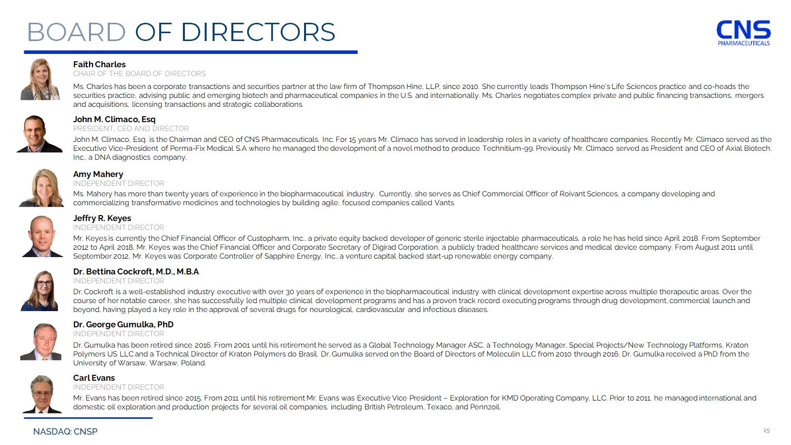 NASDAQ: CNSP 15 BOARD OF DIRECTORS Ms. Charles has been a corporate transactions and securities partner at the law firm of Thompson Hine, LLP, since 2010. She c urr ently leads Thompson Hine’s Life Sciences practice and co - heads the securities practice, advising public and emerging biotech and pharmaceutical companies in the U.S. and internationally. Ms. C har les negotiates complex private and public financing transactions, mergers and acquisitions, licensing transactions and strategic collaborations. Faith Charles CHAIR OF THE BOARD OF DIRECTORS John M. Climaco , Esq. is the Chairman and CEO of CNS Pharmaceuticals, Inc. For 15 years Mr. Climaco has served in leadership roles in a variety of healthcare companies. Recently Mr. Climaco served as the Executive Vice - President of Perma - Fix Medical S.A where he managed the development of a novel method to produce Technitium - 99. P reviously Mr. Climaco served as President and CEO of Axial Biotech, Inc., a DNA diagnostics company. John M. Climaco , Esq PRESIDENT, CEO AND DIRECTOR Ms. Mahery has more than twenty years of experience in the biopharmaceutical industry. Currently, she serves as Chief Commercial Office r of Roivant Sciences, a company developing and commercializing transformative medicines and technologies by building agile, focused companies called Vants . Amy Mahery INDEPENDENT DIRECTOR Mr. Keyes is currently the Chief Financial Officer of Custopharm , Inc., a private equity backed developer of generic sterile injectable pharmaceuticals, a role he has held since April 2018. Fr om September 2012 to April 2018, Mr. Keyes was the Chief Financial Officer and Corporate Secretary of Digirad Corporation, a publicly traded healthcare services and medical device company. From August 2011 until September 2012, Mr. Keyes was Corporate Controller of Sapphire Energy, Inc., a venture capital backed start - up renewable energy company. Jeffry R. Keyes INDEPENDENT DIRECTOR Dr. Cockroft is a well - established industry executive with over 30 years of experience in the biopharmaceutical industry with clinical devel opment expertise across multiple therapeutic areas. Over the course of her notable career, she has successfully led multiple clinical development programs and has a proven track record e xec uting programs through drug development, commercial launch and beyond, having played a key role in the approval of several drugs for neurological, cardiovascular and infectious diseases. Dr. Bettina Cockroft , M.D., M.B.A INDEPENDENT DIRECTOR Dr. Gumulka has been retired since 2016. From 2001 until his retirement he served as a Global Technology Manager ASC, a Technology Manage r, Special Projects/New Technology Platforms, Kraton Polymers US LLC and a Technical Director of Kraton Polymers do Brasil . Dr. Gumulka served on the Board of Directors of Moleculin LLC from 2010 through 2016. Dr. Gumulka received a PhD from the University of Warsaw, Warsaw, Poland. Dr. George Gumulka , PhD INDEPENDENT DIRECTOR Mr. Evans has been retired since 2015. From 2011 until his retirement Mr. Evans was Executive Vice President – Exploration for K MD Operating Company, LLC. Prior to 2011, he managed international and domestic oil exploration and production projects for several oil companies, including British Petroleum, Texaco, and Pennzoil . Carl Evans INDEPENDENT DIRECTOR