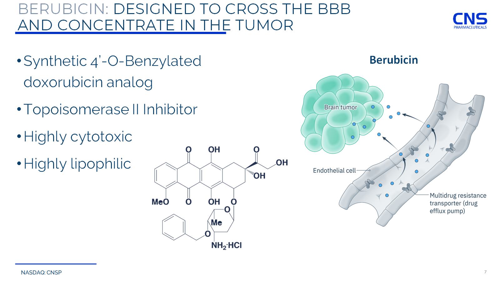 NASDAQ: CNSP 6 BERUBICIN FOR THE TREATMENT OF GBM First Novel Anthracycline Appears to Cross the Blood - Brain Barrier (BBB) and Concentrates in Tumor Tissue Within the Brain • Anthracyclines have been proven to be among the most effective anti - cancer treatments • Berubicin achieves high brain concentrations and selective uptake in tumor tissue, which provides the potential for limited off - site toxicity • Berubicin is designed to abrogate transport by MDR - associated ATP Binding Cassette (ABC) Transporter Proteins