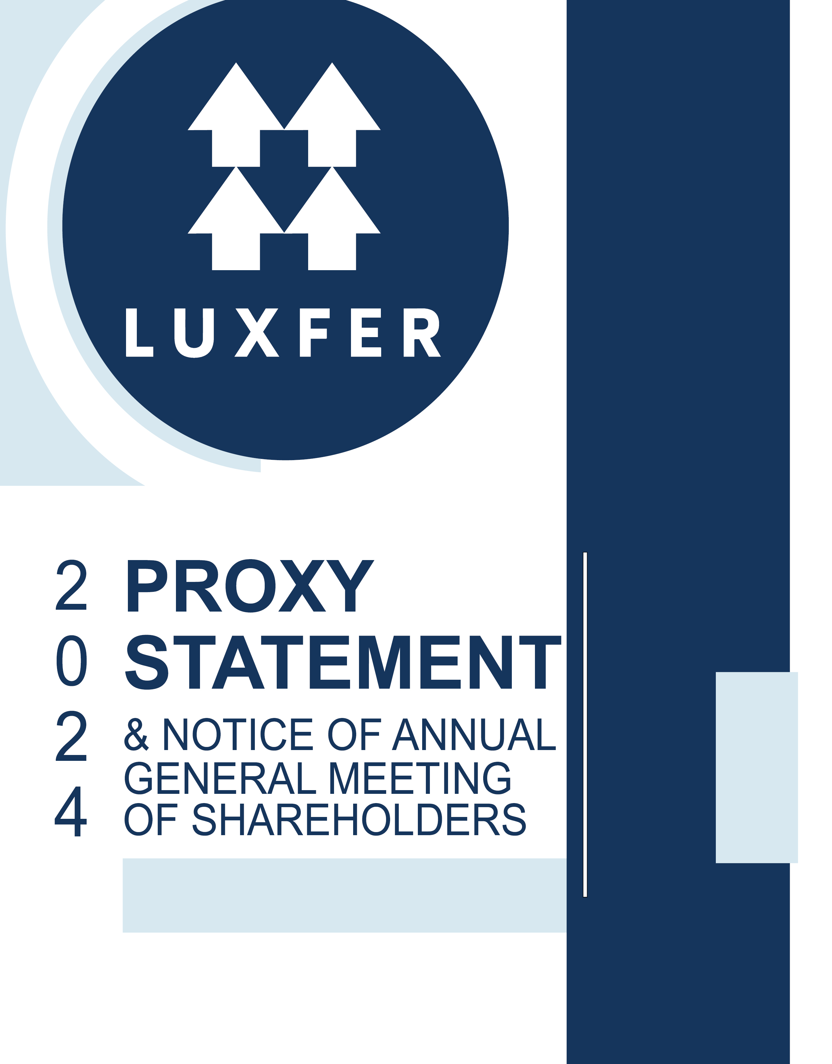 Dear Luxfer Shareholders, It is my pleasure to share the notice of Luxfer’s 2024 Annual General Meeting of Shareholders (“AGM” or the “Annual General Meeting”). The AGM will be held at the Luxfer MEL Technologies site, located at Lumns Lane, Manchester, M27 8LN, United Kingdom, on June 6, 2024, at 8:30 a.m. BST. The formal notice of the AGM is set out on page 1 of this document (the “Notice”). As a holder of ordinary shares, you may attend and/or vote at the AGM, or you may appoint another person as your proxy. To be valid, a form of proxy must be submitted in accordance with the instructions set out in the section entitled “2024 Annual General Meeting Information” on page 2. I would like to take this opportunity to reflect on the past year and outline our vision for the future. Despite facing unprecedented challenges in 2023, we remained committed to our long-term strategy to create shareholder and customer value through the development and supply of sustainable transportation solutions and life-saving defense, medical and emergency response equipment. Throughout 2023, we continued to serve niche end markets, where our technical know-how and manufacturing expertise combine to deliver a superior product. While we launched innovative products and entered new markets across a range of applications, several factors adversely impacted Luxfer’s performance in 2023, especially in the second half of the year. Record-high input costs for key raw materials presented significant challenges for our global operations and commercial teams to remain competitive without sacrificing market share. Additionally, our Elektron business experienced low demand in key end markets. Despite these obstacles, our Gas Cylinders segment saw solid growth, particularly in self-contained breathing apparatus (SCBA) applications. |
