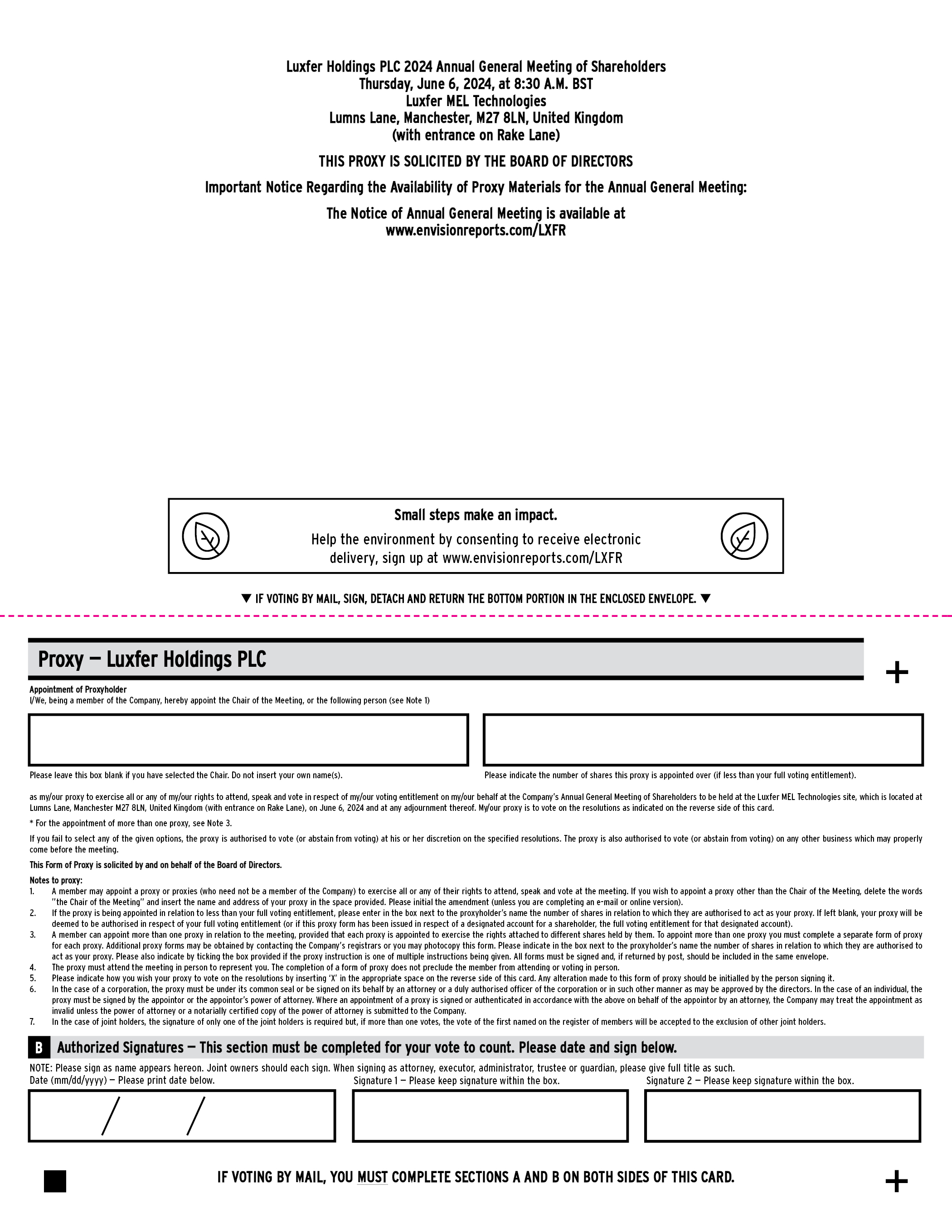IF VOTING BY MAIL, YOU MUST COMPLETE SECTIONS A AND B ON BOTH SIDES OF THIS CARD. Small steps make an impact. Help the environment by consenting to receive electronic delivery, sign up at www.envisionreports.com/LXFR Proxy — Luxfer Holdings PLC qIF VOTING BY MAIL, SIGN, DETACH AND RETURN THE BOTTOM PORTION IN THE ENCLOSED ENVELOPE.q NOTE: Please sign as name appears hereon. Joint owners should each sign. When signing as attorney, executor, administrator, trustee or guardian, please give full title as such. Date (mm/dd/yyyy) — Please print date below. Signature 1 — Please keep signature within the box. Signature 2 — Please keep signature within the box. B Authorized Signatures — This section must be completed for your vote to count. Please date and sign below. as my/our proxy to exercise all or any of my/our rights to attend, speak and vote in respect of my/our voting entitlement on my/our behalf at the Company’s Annual General Meeting of Shareholders to be held at the Luxfer MEL Technologies site, which is located at Lumns Lane, Manchester M27 8LN, United Kingdom (with entrance on Rake Lane), on June 6, 2024 and at any adjournment thereof. My/our proxy is to vote on the resolutions as indicated on the reverse side of this card. * For the appointment of more than one proxy, see Note 3. If you fail to select any of the given options, the proxy is authorised to vote (or abstain from voting) at his or her discretion on the specified resolutions. The proxy is also authorised to vote (or abstain from voting) on any other business which may properly come before the meeting. This Form of Proxy is solicited by and on behalf of the Board of Directors. Notes to proxy: 1. A member may appoint a proxy or proxies (who need not be a member of the Company) to exercise all or any of their rights to attend, speak and vote at the meeting. If you wish to appoint a proxy other than the Chair of the Meeting, delete the words ”the Chair of the Meeting” and insert the name and address of your proxy in the space provided. Please initial the amendment (unless you are completing an e-mail or online version). 2. If the proxy is being appointed in relation to less than your full voting entitlement, please enter in the box next to the proxyholder’s name the number of shares in relation to which they are authorised to act as your proxy. If left blank, your proxy will be deemed to be authorised in respect of your full voting entitlement (or if this proxy form has been issued in respect of a designated account for a shareholder, the full voting entitlement for that designated account). 3. A member can appoint more than one proxy in relation to the meeting, provided that each proxy is appointed to exercise the rights attached to different shares held by them. To appoint more than one proxy you must complete a separate form of proxy for each proxy. Additional proxy forms may be obtained by contacting the Company’s registrars or you may photocopy this form. Please indicate in the box next to the proxyholder’s name the number of shares in relation to which they are authorised to act as your proxy. Please also indicate by ticking the box provided if the proxy instruction is one of multiple instructions being given. All forms must be signed and, if returned by post, should be included in the same envelope. 4. The proxy must attend the meeting in person to represent you. The completion of a form of proxy does not preclude the member from attending or voting in person. 5. Please indicate how you wish your proxy to vote on the resolutions by inserting ‘X’ in the appropriate space on the reverse side of this card. Any alteration made to this form of proxy should be initialled by the person signing it. 6. In the case of a corporation, the proxy must be under its common seal or be signed on its behalf by an attorney or a duly authorised officer of the corporation or in such other manner as may be approved by the directors. In the case of an individual, the proxy must be signed by the appointor or the appointor’s power of attorney. Where an appointment of a proxy is signed or authenticated in accordance with the above on behalf of the appointor by an attorney, the Company may treat the appointment as invalid unless the power of attorney or a notarially certified copy of the power of attorney is submitted to the Company. 7. In the case of joint holders, the signature of only one of the joint holders is required but, if more than one votes, the vote of the first named on the register of members will be accepted to the exclusion of other joint holders. Appointment of Proxyholder l/We, being a member of the Company, hereby appoint the Chair of the Meeting, or the following person (see Note 1) Please leave this box blank if you have selected the Chair. Do not insert your own name(s). Please indicate the number of shares this proxy is appointed over (if less than your full voting entitlement). Luxfer Holdings PLC 2024 Annual General Meeting of Shareholders Thursday, June 6, 2024, at 8:30 A.M. BST Luxfer MEL Technologies Lumns Lane, Manchester, M27 8LN, United Kingdom (with entrance on Rake Lane) THIS PROXY IS SOLICITED BY THE BOARD OF DIRECTORS Important Notice Regarding the Availability of Proxy Materials for the Annual General Meeting: The Notice of Annual General Meeting is available at www.envisionreports.com/LXFR