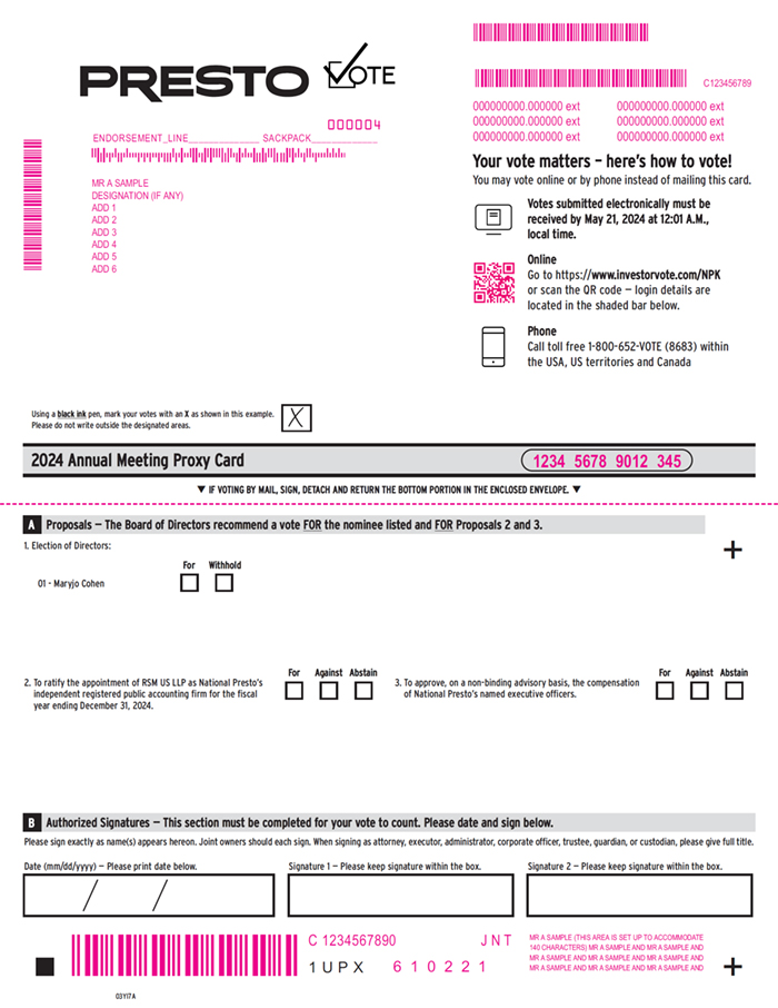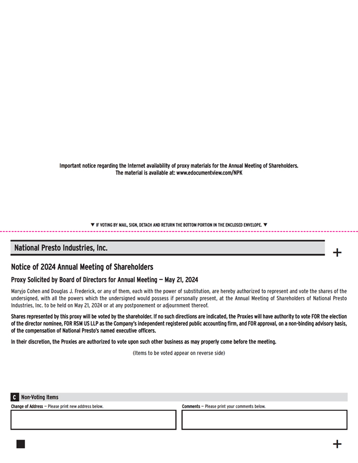 | Our Notice of Annual Meeting of Stockholders, Proxy Statement, and 2023 Annual Report on Form 10-K are available on the National Presto website at www.gopresto.com/proxy/. |