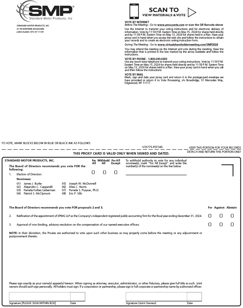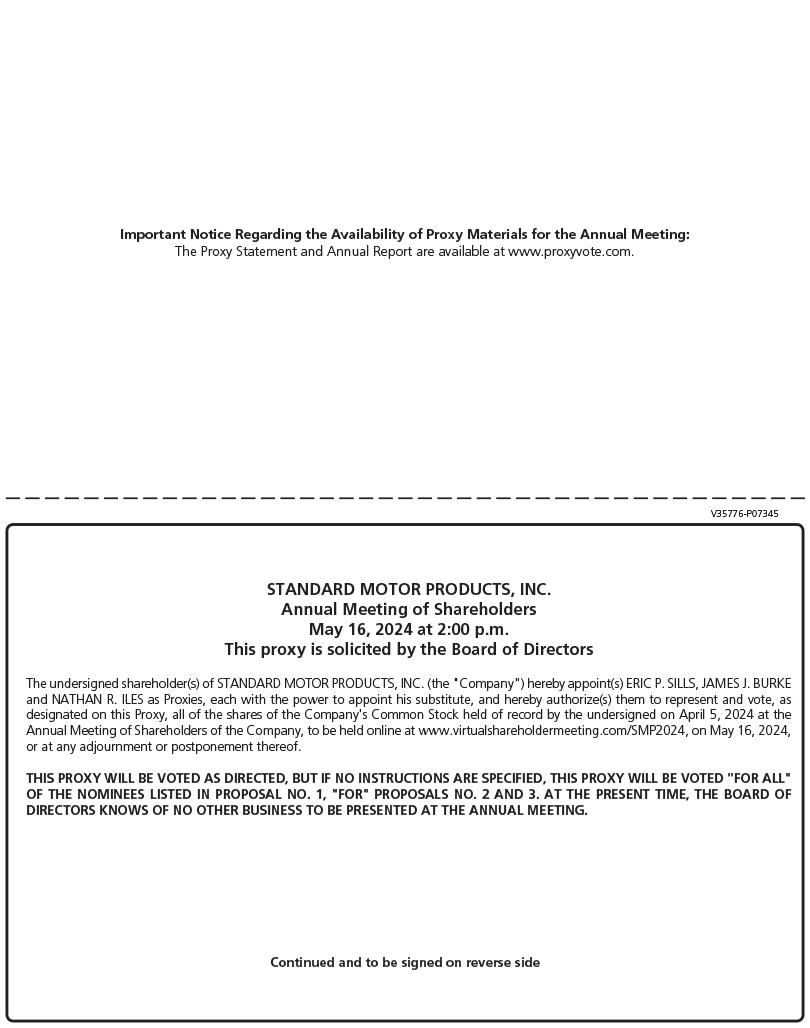 NOTICE IS HEREBY GIVEN that the Annual Meeting of Shareholders of STANDARD MOTOR PRODUCTS, INC. (the “Company”) will be held online at www.virtualshareholder-meeting.com/SMP2024 on Thursday, May 16, 2024 at 2:00 p.m. (Eastern Daylight Time). The Annual Meeting will be held for the following purposes: