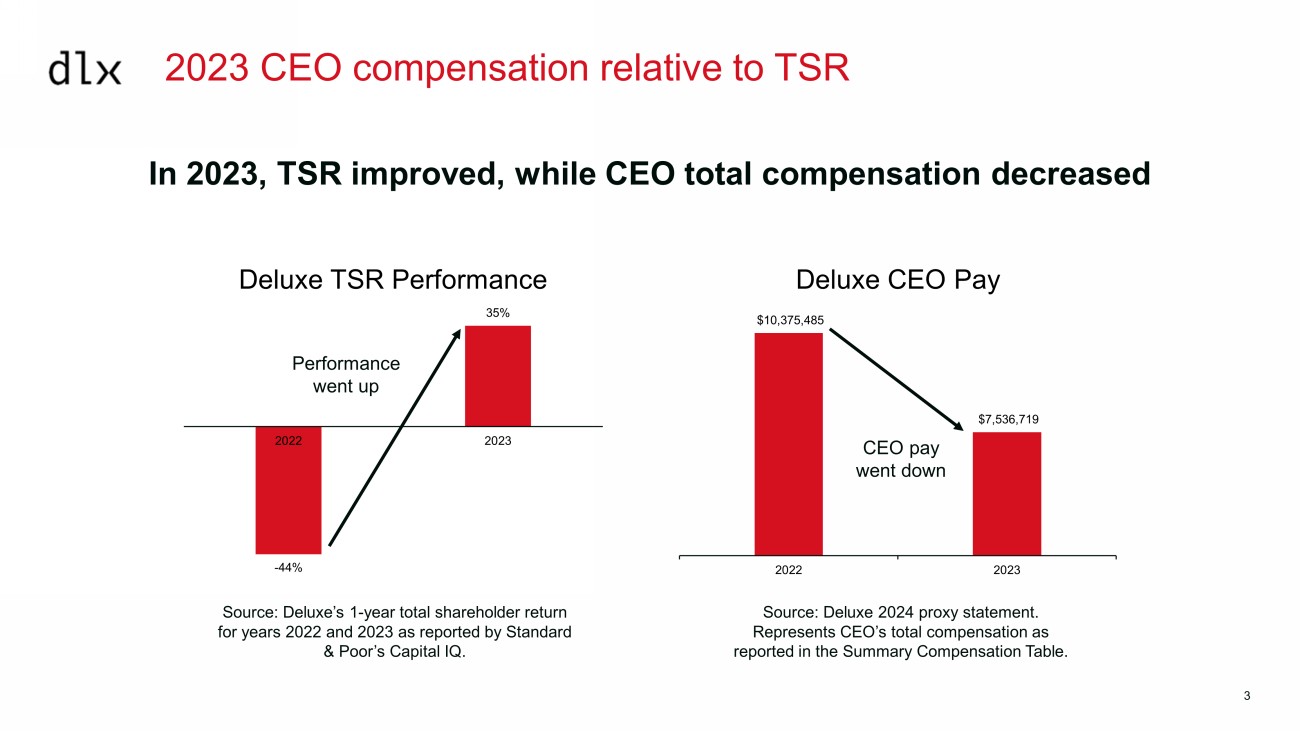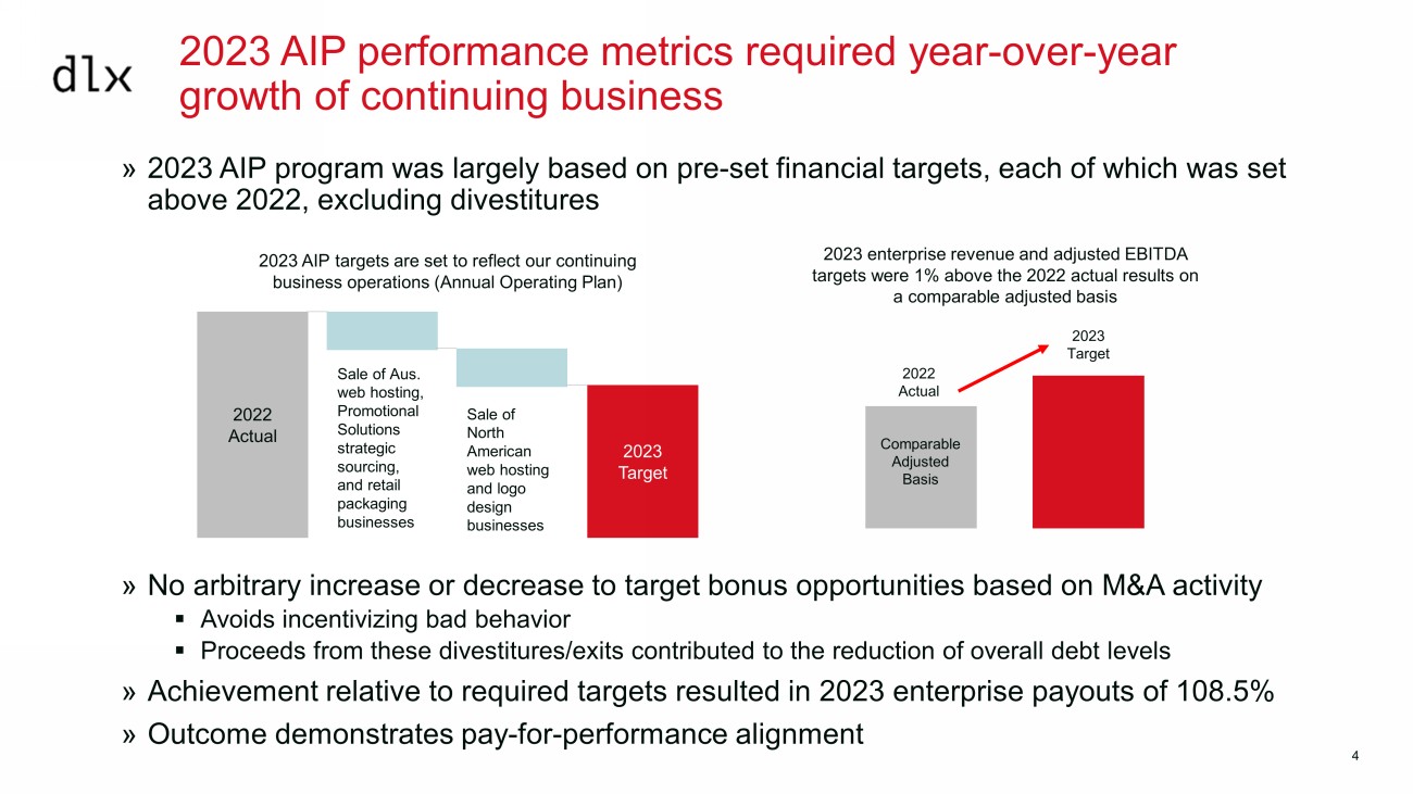 3 In 2023, TSR improved, while CEO total compensation decreased 2023 CEO compensation relative to TSR - 44% 35% 2022 2023 Deluxe TSR Performance Source: Deluxe’s 1 - year total shareholder return for years 2022 and 2023 as reported by Standard & Poor’s Capital IQ. Performance went up $10,375,485 $7,536,719 2022 2023 Deluxe CEO Pay Source: Deluxe 2024 proxy statement. Represents CEO’s total compensation as reported in the Summary Compensation Table. CEO pay went down