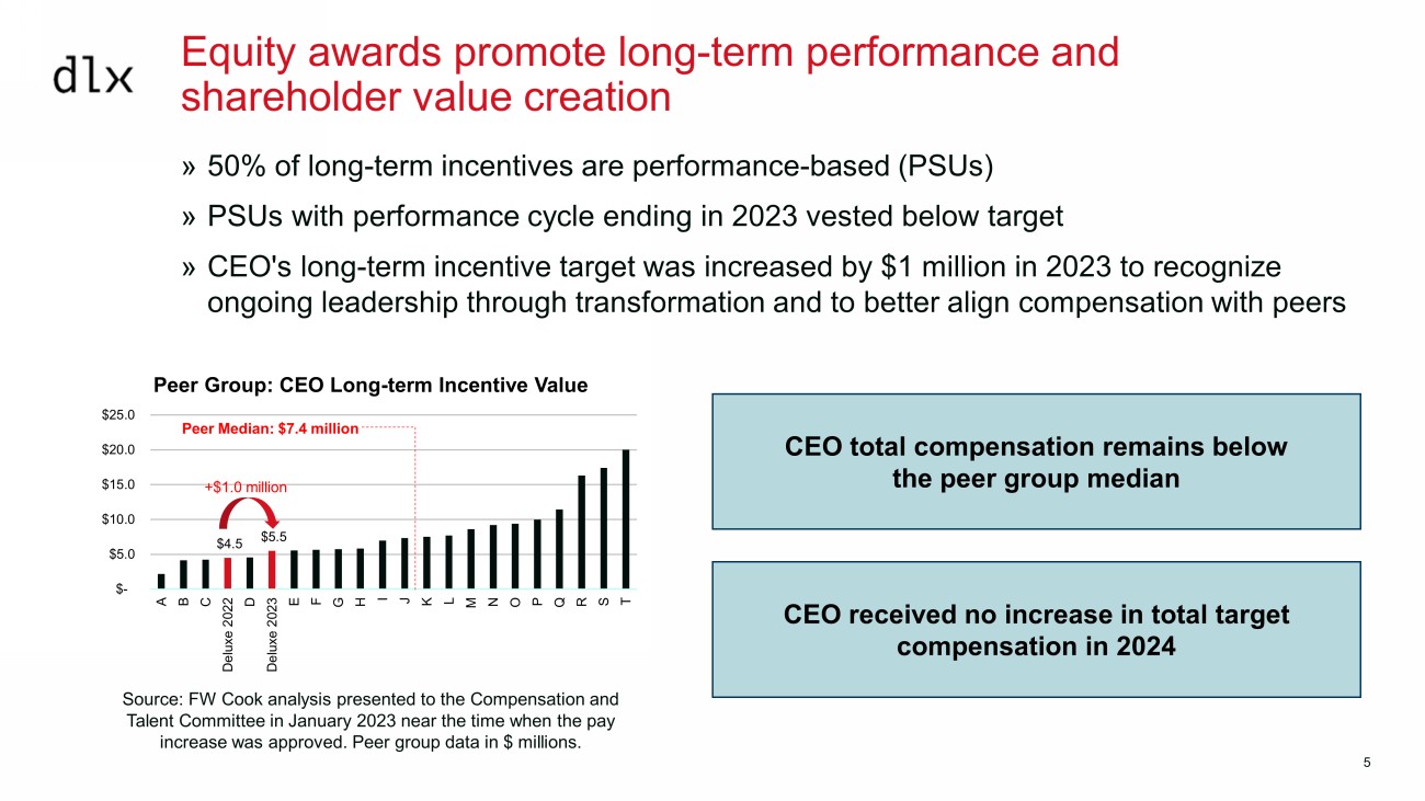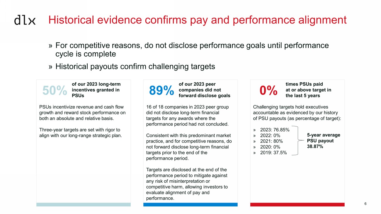 5 » 50% of long - term incentives are performance - based (PSUs) » PSUs with performance cycle ending in 2023 vested below target » CEO's long - term incentive target was increased by $1 million in 2023 to recognize ongoing leadership through transformation and to better align compensation with peers Equity awards promote long - term performance and shareholder value creation $4.5 $5.5 $- $5.0 $10.0 $15.0 $20.0 $25.0 A B C Deluxe 2022 D Deluxe 2023 E F G H I J K L M N O P Q R S T Peer Group: CEO Long - term Incentive Value Peer Median: $7.4 million +$1.0 million Source: FW Cook analysis presented to the Compensation and Talent Committee in January 2023 near the time when the pay increase was approved. Peer group data in $ millions. CEO total compensation remains below the peer group median CEO received no increase in total target compensation in 2024
