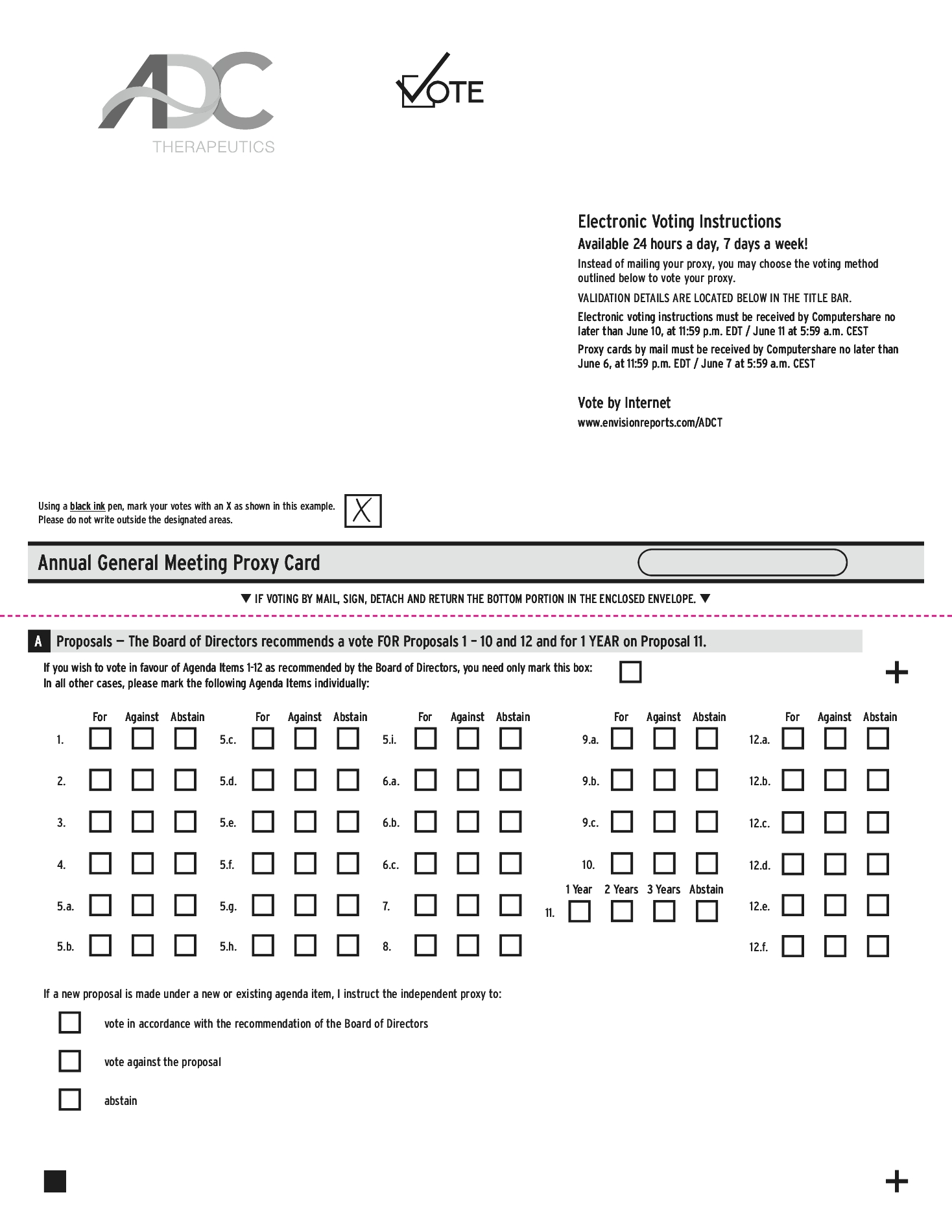 ADC Therapeutics SA (the “Company”) is soliciting proxies for the Annual Meeting. You are receiving this Proxy Statement because you owned common shares of the Company at the close of business on April 12, 2024, the record date for the Annual Meeting, which entitles you to vote at the Annual Meeting. By use of a proxy, you can vote whether or not you attend the Annual Meeting. This Proxy Statement describes the matters on which we would like you to vote and provides information on those matters so that you can make an informed decision.