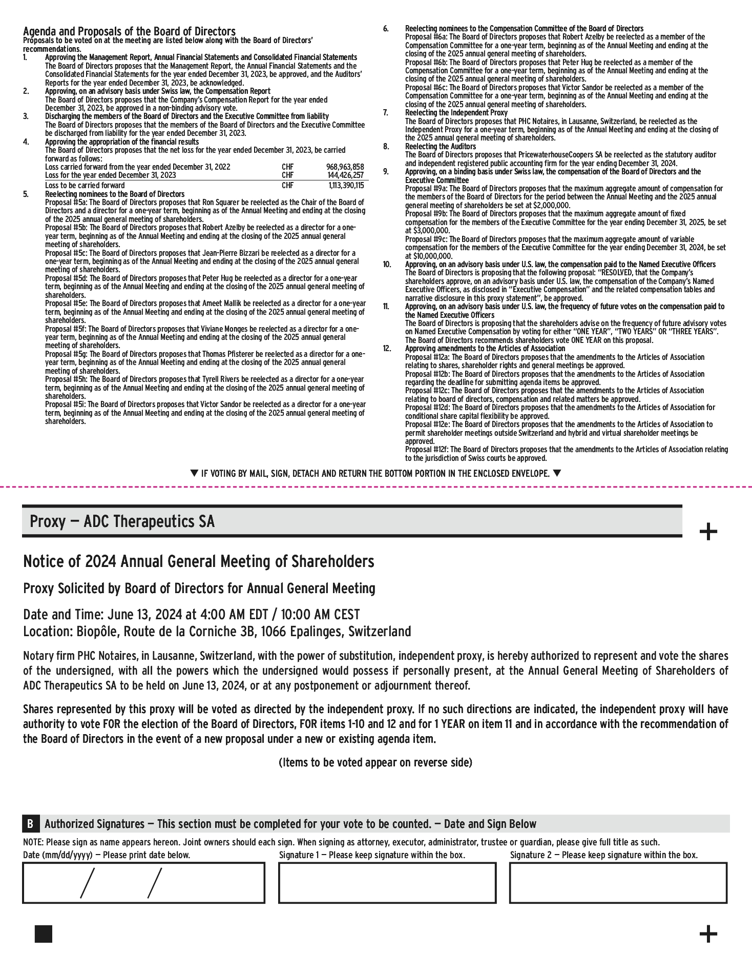 This Proxy Statement is not a form for voting and presents only an overview of the proxy materials, which contain important information. You are encouraged to access and view the complete proxy materials before voting. This Proxy Statement and the proxy materials, including our Annual Report on Form 10-K, management report, annual financial statements, consolidated financial statements, auditors’ reports and compensation report for the year ended December 31, 2023, are available for viewing, printing and downloading at ir.adctherapeutics.com/sec-filings/annual-reports-and-proxies/default.aspx. Additionally, you can find a copy of this Proxy Statement and our Annual Report on Form 10-K on the website of the U.S. Securities and Exchange Commission (the “SEC”) at sec.gov. You may also obtain a printed copy of this Proxy Statement and the proxy materials, including our Annual Report on Form 10-K, management report, annual financial statements, consolidated financial statements, auditors’ reports and compensation report for the year ended December 31, 2023, at no cost, upon written or oral request to us at the following address: Investor Relations, ADC Therapeutics SA, c/o ADC Therapeutics America, Inc., 430 Mountain Avenue, 4th Floor, Murray Hill, NJ 07974; (908) 731-5556.