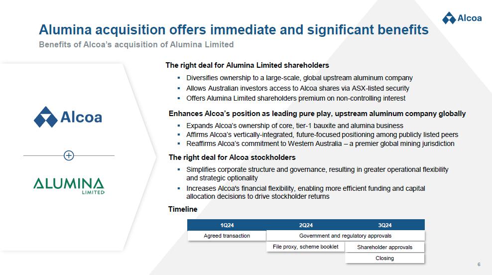 5 Alumina Limited acquisition simplifies ownership structure Comparison of pre - and post - acquisition ownership structures of Alcoa and AWAC joint venture Primary aluminum smelter and casthouse portfolio (ex - AWAC) Up st rea m assets (ex - AWAC) Primary a lu m in u m assets Energy assets From complex ownership at a sub - segment level… Aluminum Alumina urrent Alcoa shareholders: 68.75% 1 mina Limited shareholders: 31.25% 1 Aluminum Alumina ▪ Pro forma 31.25% ownership 1 across all tier - 1 bauxite and alumina assets and aluminum smelter portfolio ▪ Alumina Limited shareholders retain effective 31.25% ownership of AWAC assets (versus 40% today) ▪ Allows Australian investors access to Alcoa shares via an ASX - listed security …to streamlined ownership at the wholeco level 1. Based on fully diluted shares outstanding for Alcoa and Alumina Limited as of February 23, 2024 C A lu AWAC mine and refinery assets 60% 40% P or tla n d smelter ( A W A C ) 60% 40% Alumina Limited position