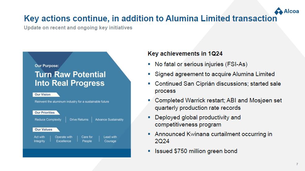 Key actions continue, in addition to Alumina Limited transaction Update on recent and ongoing key initiatives Key achievements in 1Q24 ▪ No fatal or serious injuries (FSI - As) ▪ Signed agreement to acquire Alumina Limited ▪ Continued San Ciprián discussions; started sale process ▪ Completed Warrick restart; ABI and Mosjøen set quarterly production rate records ▪ Deployed global productivity and competitiveness program ▪ Announced Kwinana curtailment occurring in 2Q24 ▪ Issued $750 million green bond 7