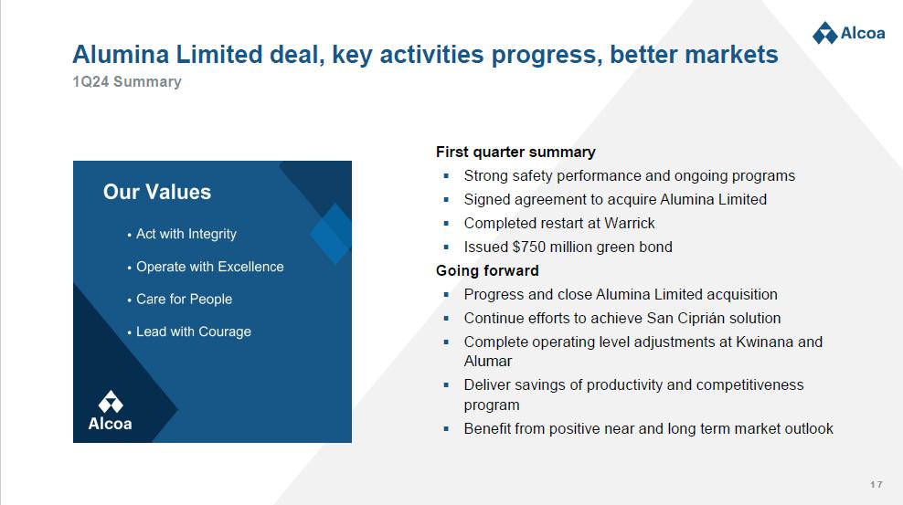 Item 1: On April 17, 2024, Alcoa posted an investor presentation (the “Presentation”) on its website in connection with Alcoa’s announcement of its financial results for the first quarter of 2024. Excerpts from the Presentation that referenced the Transaction are filed herewith as Exhibit 1.