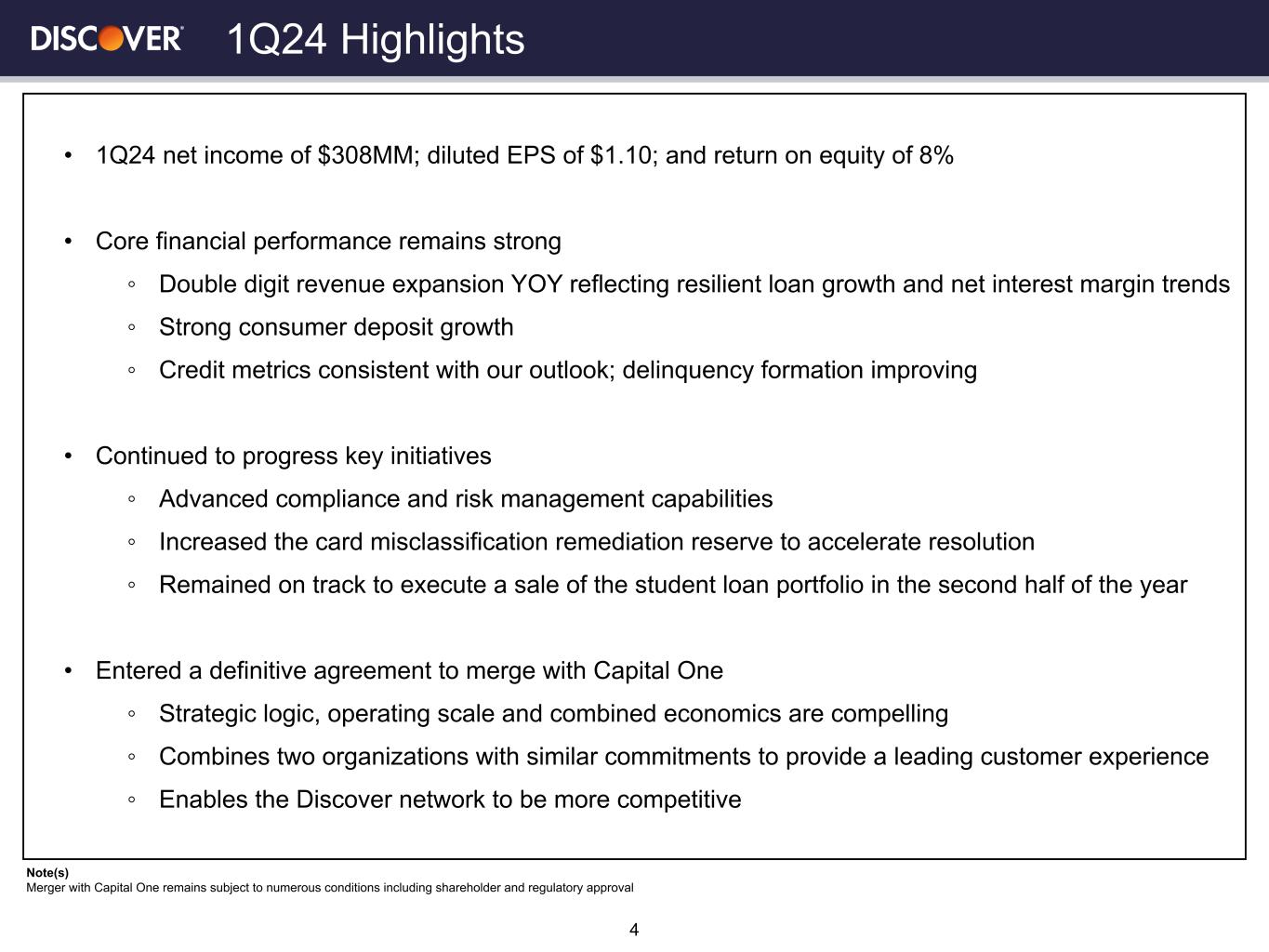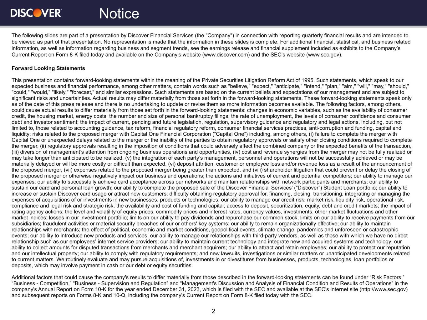 The following slides are part of a presentation by Discover Financial Services (the "Company") in connection with reporting quarterly financial results and are intended to be viewed as part of that presentation. No representation is made that the information in these slides is complete. For additional financial, statistical, and business related information, as well as information regarding business and segment trends, see the earnings release and financial supplement included as exhibits to the Company’s Current Report on Form 8-K filed today and available on the Company’s website (www.discover.com) and the SEC’s website (www.sec.gov). Forward Looking Statements This presentation contains forward-looking statements within the meaning of the Private Securities Litigation Reform Act of 1995. Such statements, which speak to our expected business and financial performance, among other matters, contain words such as "believe," "expect," "anticipate," "intend," "plan," "aim," "will," "may," "should," "could," "would," "likely," "forecast," and similar expressions. Such statements are based on the current beliefs and expectations of our management and are subject to significant risks and uncertainties. Actual results may differ materially from those set forth in the forward-looking statements. These forward-looking statements speak only as of the date of this press release and there is no undertaking to update or revise them as more information becomes available. The following factors, among others, could cause actual results to differ materially from those set forth in the forward-looking statements: changes in economic variables, such as the availability of consumer credit, the housing market, energy costs, the number and size of personal bankruptcy filings, the rate of unemployment, the levels of consumer confidence and consumer debt and investor sentiment; the impact of current, pending and future legislation, regulation, supervisory guidance and regulatory and legal actions, including, but not limited to, those related to accounting guidance, tax reform, financial regulatory reform, consumer financial services practices, anti-corruption and funding, capital and liquidity; risks related to the proposed merger with Capital One Financial Corporation (“Capital One”) including, among others, (i) failure to complete the merger with Capital One or unexpected delays related to the merger or the inability of the parties to obtain regulatory approvals or satisfy other closing conditions required to complete the merger, (ii) regulatory approvals resulting in the imposition of conditions that could adversely affect the combined company or the expected benefits of the transaction, (iii) diversion of management’s attention from ongoing business operations and opportunities, (iv) cost and revenue synergies from the merger may not be fully realized or may take longer than anticipated to be realized, (v) the integration of each party’s management, personnel and operations will not be successfully achieved or may be materially delayed or will be more costly or difficult than expected, (vi) deposit attrition, customer or employee loss and/or revenue loss as a result of the announcement of the proposed merger, (vii) expenses related to the proposed merger being greater than expected, and (viii) shareholder litigation that could prevent or delay the closing of the proposed merger or otherwise negatively impact our business and operations; the actions and initiatives of current and potential competitors; our ability to manage our expenses; our ability to successfully achieve card acceptance across our networks and maintain relationships with network participants and merchants; our ability to sustain our card and personal loan growth; our ability to complete the proposed sale of the Discover Financial Services’ (“Discover”) Student Loan portfolio; our ability to increase or sustain Discover card usage or attract new customers; difficulty obtaining regulatory approval for, financing, closing, transitioning, integrating or managing the expenses of acquisitions of or investments in new businesses, products or technologies; our ability to manage our credit risk, market risk, liquidity risk, operational risk, compliance and legal risk and strategic risk; the availability and cost of funding and capital; access to deposit, securitization, equity, debt and credit markets; the impact of rating agency actions; the level and volatility of equity prices, commodity prices and interest rates, currency values, investments, other market fluctuations and other market indices; losses in our investment portfolio; limits on our ability to pay dividends and repurchase our common stock; limits on our ability to receive payments from our subsidiaries; fraudulent activities or material security breaches of our or others' key systems; our ability to remain organizationally effective; our ability to maintain relationships with merchants; the effect of political, economic and market conditions, geopolitical events, climate change, pandemics and unforeseen or catastrophic events; our ability to introduce new products and services; our ability to manage our relationships with third-party vendors, as well as those with which we have no direct relationship such as our employees' internet service providers; our ability to maintain current technology and integrate new and acquired systems and technology; our ability to collect amounts for disputed transactions from merchants and merchant acquirers; our ability to attract and retain employees; our ability to protect our reputation and our intellectual property; our ability to comply with regulatory requirements; and new lawsuits, investigations or similar matters or unanticipated developments related to current matters. We routinely evaluate and may pursue acquisitions of, investments in or divestitures from businesses, products, technologies, loan portfolios or deposits, w