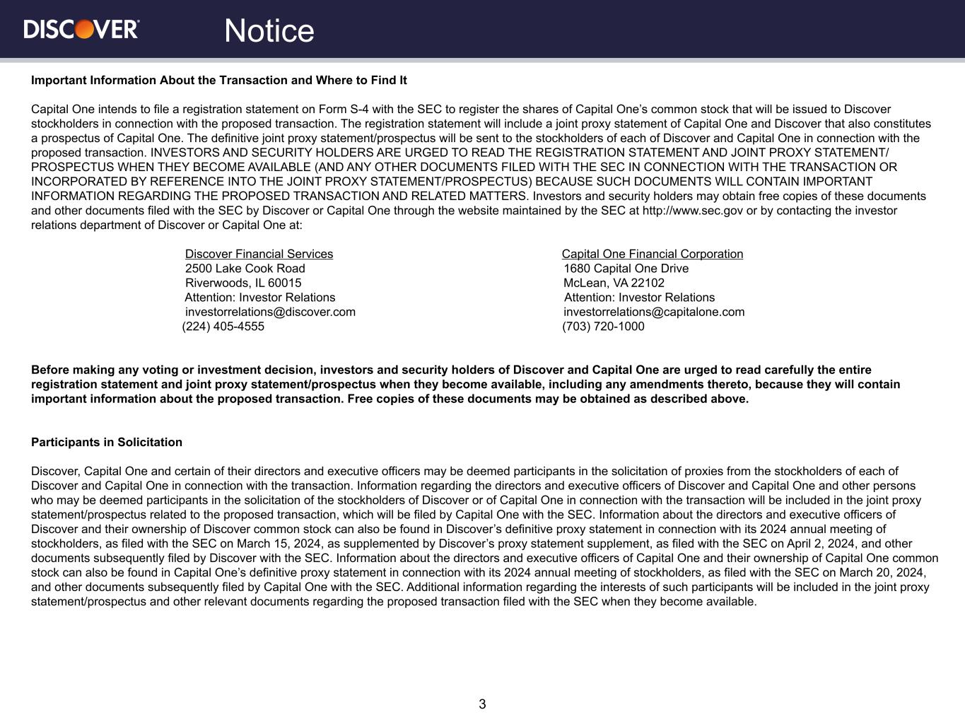 Important Information About the Transaction and Where to Find It Capital One intends to file a registration statement on Form S-4 with the SEC to register the shares of Capital One’s common stock that will be issued to Discover stockholders in connection with the proposed transaction. The registration statement will include a joint proxy statement of Capital One and Discover that also constitutes a prospectus of Capital One. The definitive joint proxy statement/prospectus will be sent to the stockholders of each of Discover and Capital One in connection with the proposed transaction. INVESTORS AND SECURITY HOLDERS ARE URGED TO READ THE REGISTRATION STATEMENT AND JOINT PROXY STATEMENT/ PROSPECTUS WHEN THEY BECOME AVAILABLE (AND ANY OTHER DOCUMENTS FILED WITH THE SEC IN CONNECTION WITH THE TRANSACTION OR INCORPORATED BY REFERENCE INTO THE JOINT PROXY STATEMENT/PROSPECTUS) BECAUSE SUCH DOCUMENTS WILL CONTAIN IMPORTANT INFORMATION REGARDING THE PROPOSED TRANSACTION AND RELATED MATTERS. Investors and security holders may obtain free copies of these documents and other documents filed with the SEC by Discover or Capital One through the website maintained by the SEC at http://www.sec.gov or by contacting the investor relations department of Discover or Capital One at: Discover Financial Services Capital One Financial Corporation 2500 Lake Cook Road 1680 Capital One Drive Riverwoods, IL 60015 McLean, VA 22102 Attention: Investor Relations Attention: Investor Relations investorrelations@discover.com investorrelations@capitalone.com (224) 405-4555 (703) 720-1000 Before making any voting or investment decision, investors and security holders of Discover and Capital One are urged to read carefully the entire registration statement and joint proxy statement/prospectus when they become available, including any amendments thereto, because they will contain important information about the proposed transaction. Free copies of these documents may be obtained as described above. Participants in Solicitation Discover, Capital One and certain of their directors and executive officers may be deemed participants in the solicitation of proxies from the stockholders of each of Discover and Capital One in connection with the transaction. Information regarding the directors and executive officers of Discover and Capital One and other persons who may be deemed participants in the solicitation of the stockholders of Discover or of Capital One in connection with the transaction will be included in the joint proxy statement/prospectus related to the proposed transaction, which will be filed by Capital One with the SEC. Information about the directors and executive officers of Discover and their ownership of Discover common stock can also be found in Discover’s definitive proxy statement in connection with its 2024 annual meeting of stockholders, as filed with the SEC on March 15, 2024, as supplemented by Discover’s proxy statement supplement, as filed with the SEC on April 2, 2024, and other documents subsequently filed by Discover with the SEC. Information about the directors and executive officers of Capital One and their ownership of Capital One common stock can also be found in Capital One’s definitive proxy statement in connection with its 2024 annual meeting of stockholders, as filed with the SEC on March 20, 2024, and other documents subsequently filed by Capital One with the SEC. Additional information regarding the interests of such participants will be included in the joint proxy statement/prospectus and other relevant documents regarding the proposed transaction filed with the SEC when they become available. Notice 3
